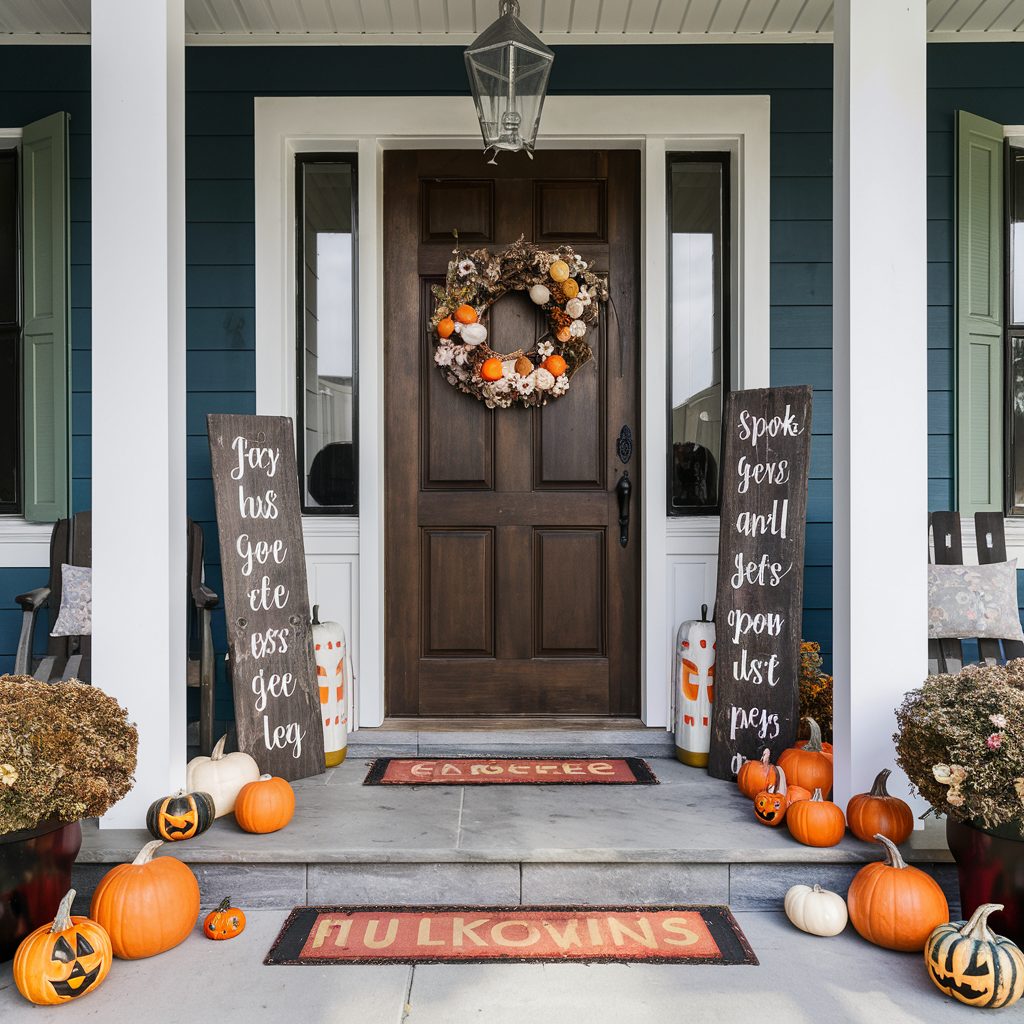 To tie everything together, place a seasonal doormat at the doorstep—one that celebrates autumn but with a Halloween twist, such as featuring pumpkins, bats, or playful warnings. These simple yet impactful touches help create a cohesive and inviting entryway that reflects the holiday spirit while still keeping your porch stylish and welcoming.