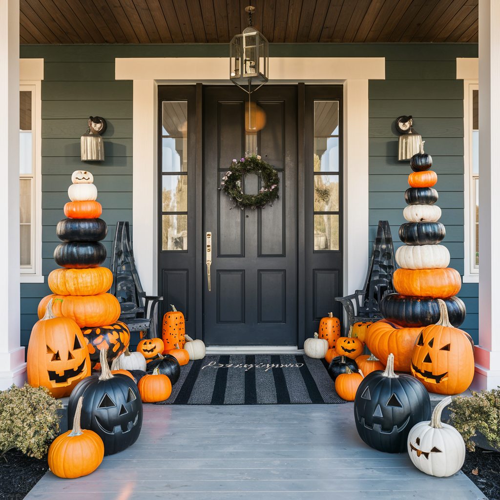 No Halloween porch is truly complete without the iconic presence of pumpkins. Whether you use real ones or opt for durable artificial varieties, pumpkins are a must-have decoration that instantly sets the seasonal tone. Their versatility allows for endless creative expression, making them ideal for any porch setup. A visually striking idea is to stack pumpkins of varying sizes and shades—orange, white, green, or even metallics—for a layered, dimensional effect.