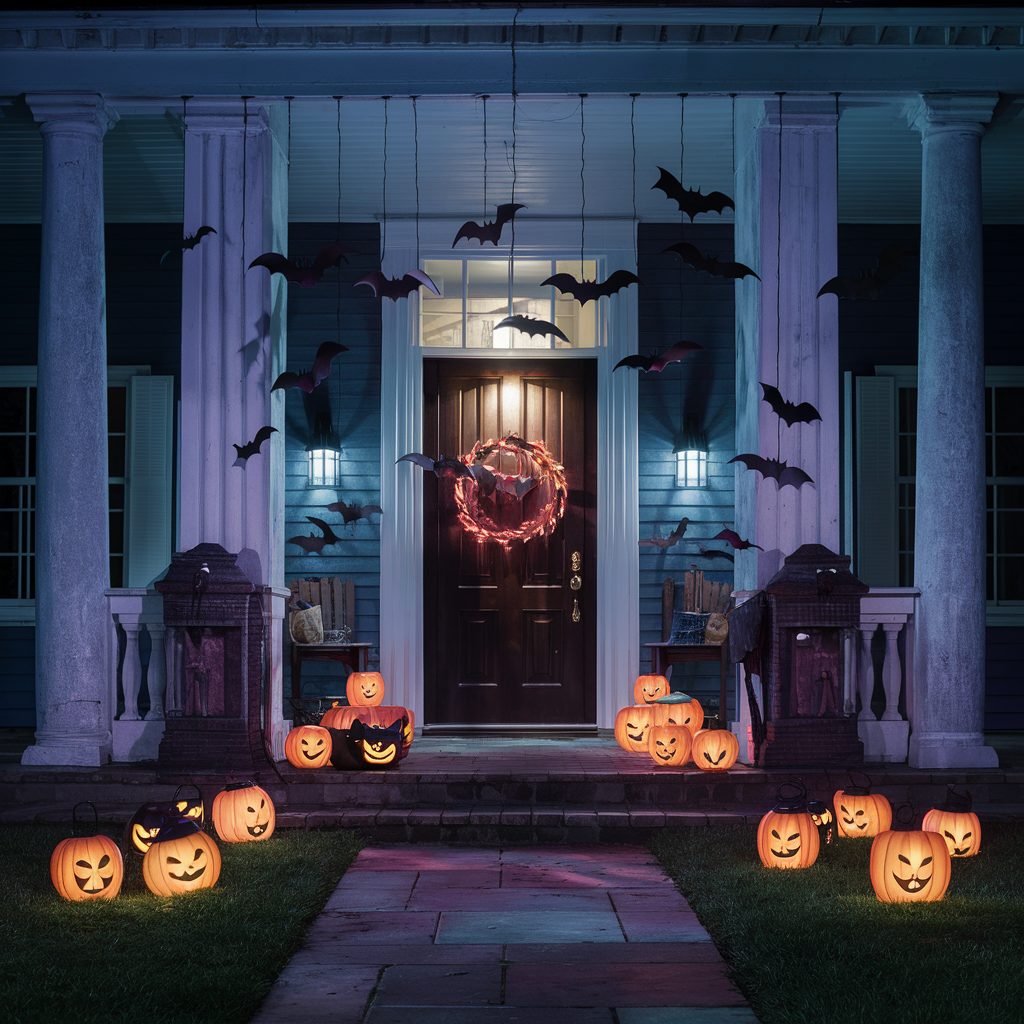 You can also place bat-themed decorations on your door or windows to add subtle creepiness. For a bolder statement, consider vivid bat cutouts with backlighting or lanterns shaped like bats to create an atmospheric glow.