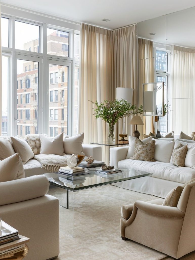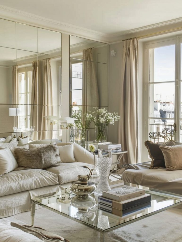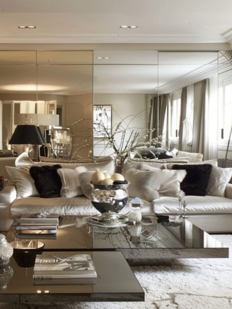 The reflective surfaces not only amplify the sense of space but also bring an element of sophistication to your décor. This technique works well with a variety of styles, from vintage to modern, adding both functionality and elegance to your living room.