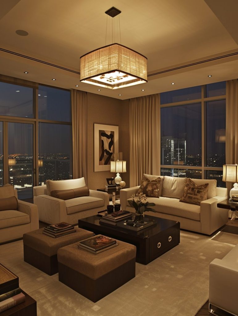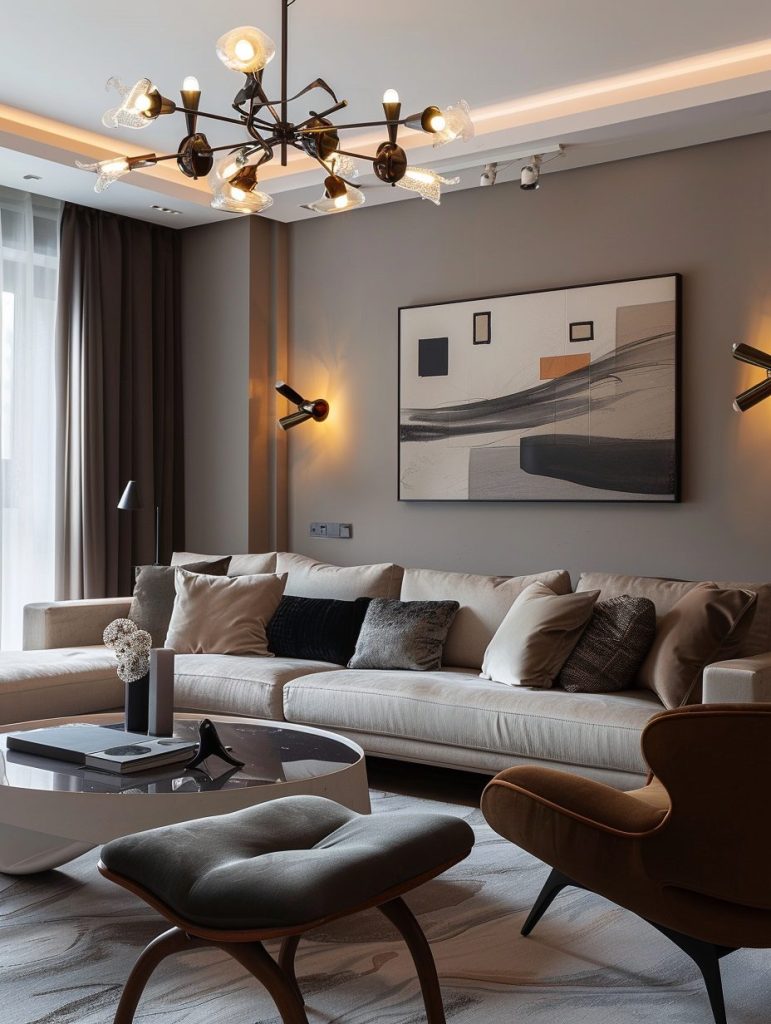 Choose stylish lighting fixtures like chandeliers, floor lamps, and wall sconces that align with your décor style. Well-planned lighting not only enhances the room’s atmosphere but also highlights key features, making the space feel inviting and dynamic.