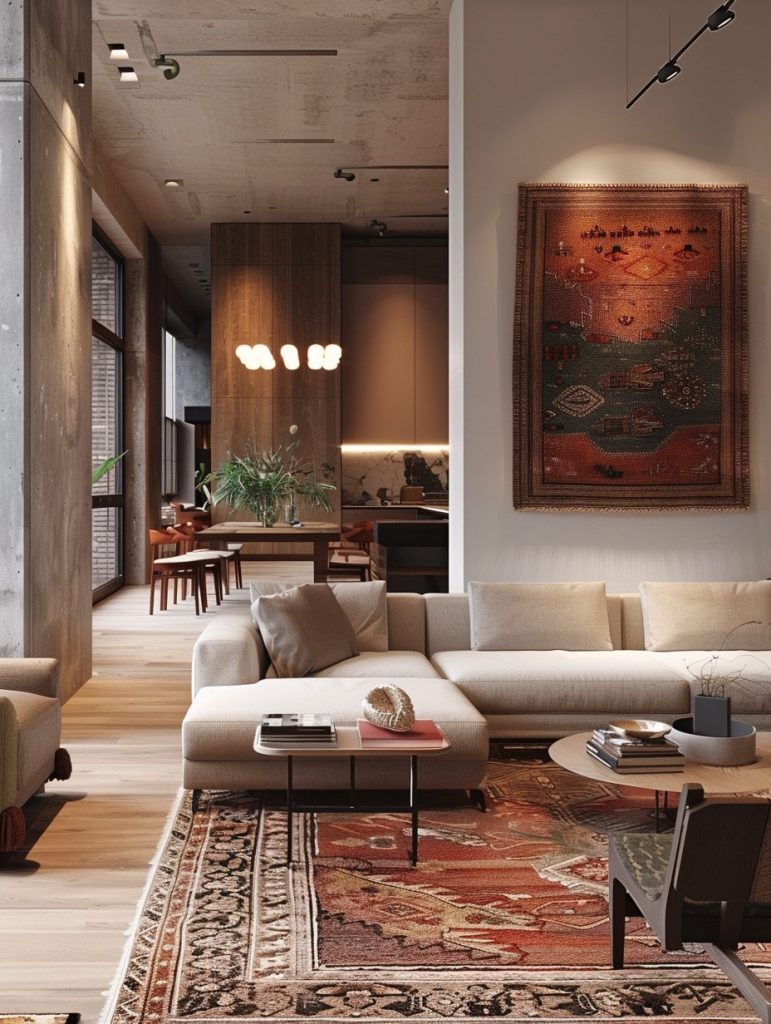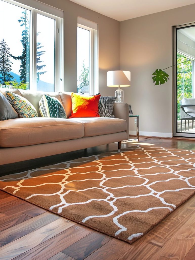 Select rugs with colors and patterns that complement your overall décor to tie the room together. In open-plan layouts, rugs can also act as a visual boundary, helping to separate different functional zones and enhance the space’s flow.
