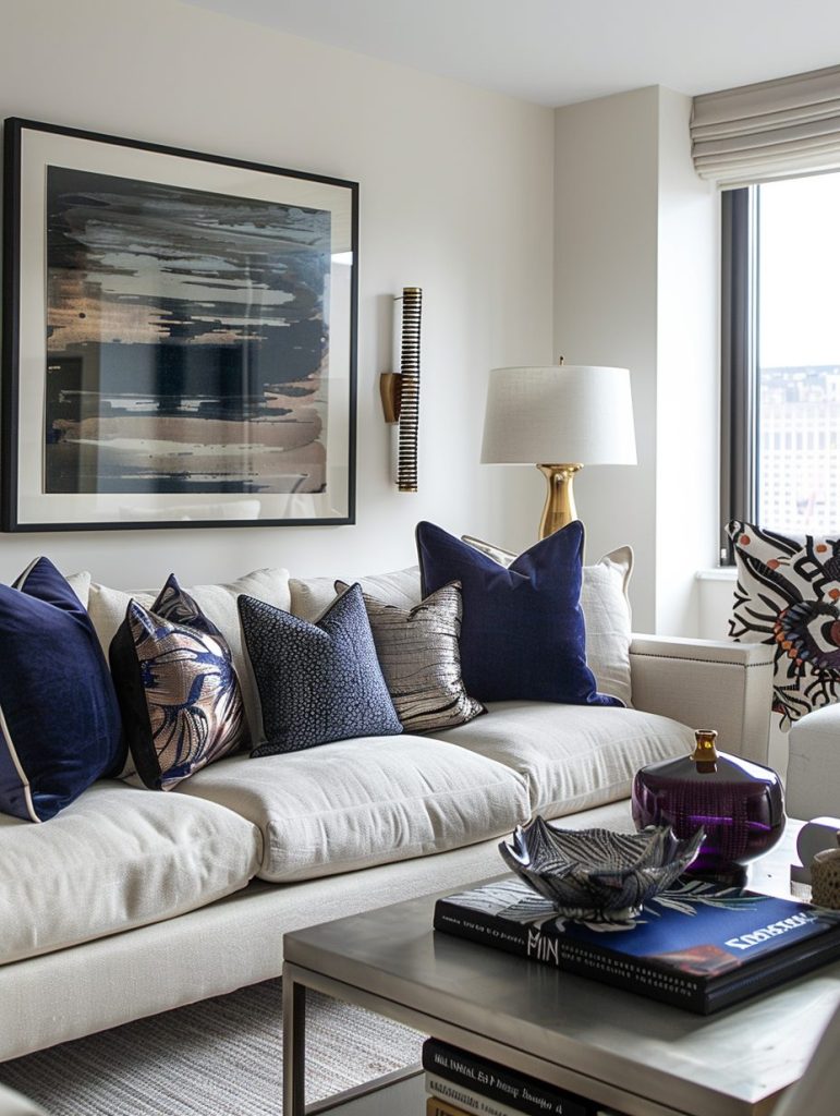 A powerful apartment living room can be created by layering a variety of textiles and materials. Mix soft fabrics like velvet and linen with harder elements such as wood and metal. Add dimension with textured pillows, rugs, and throws.