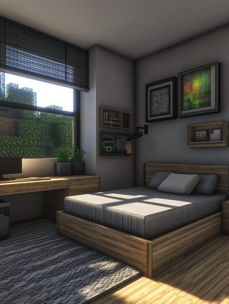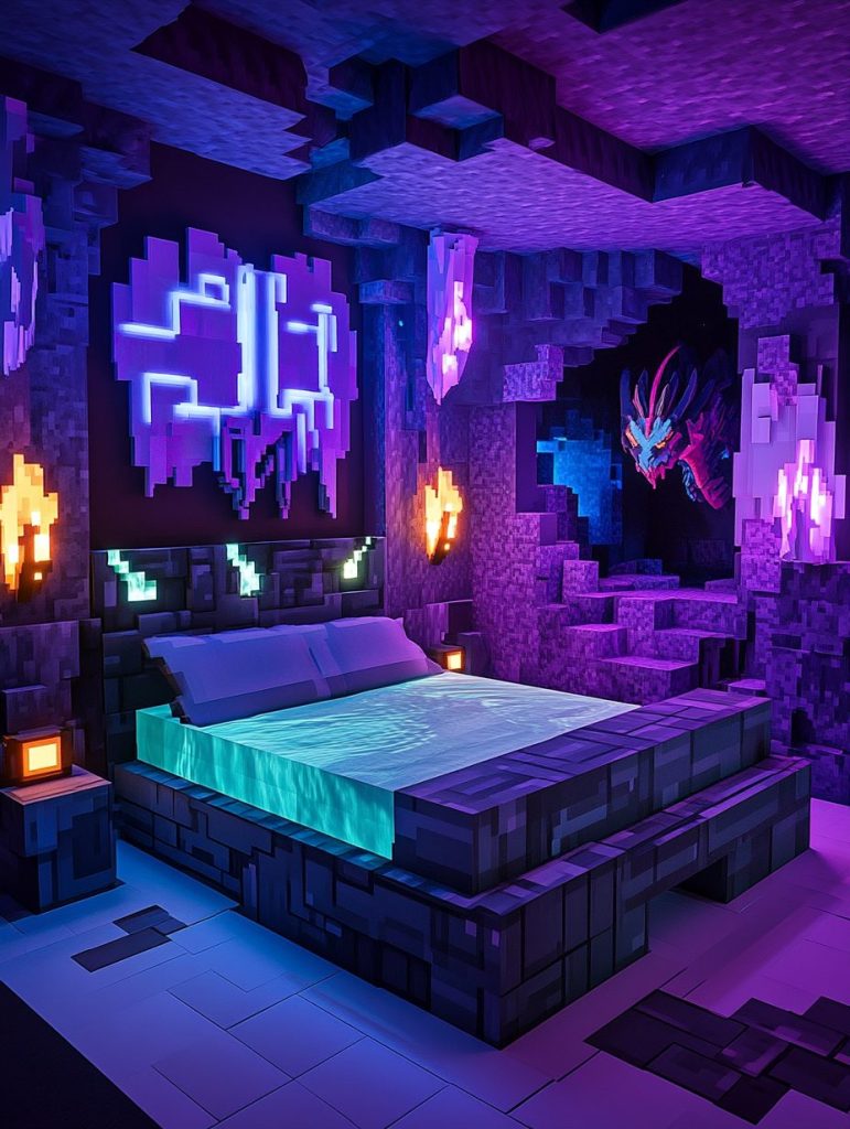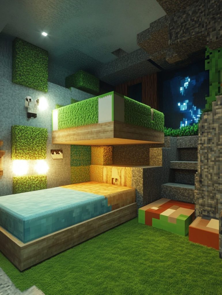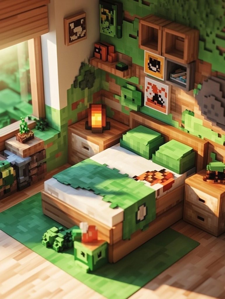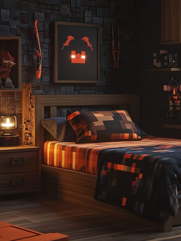 Think custom-built beds modeled after your favorite Minecraft build, abstract wall art that incorporates pixel-inspired visuals in a new way, or a color scheme that blends vibrant tones with muted textures for a fresh aesthetic. Every element should feel intentional and personal—from lighting that sets a dramatic mood to handmade accessories or Minecraft-themed items reimagined with a twist.