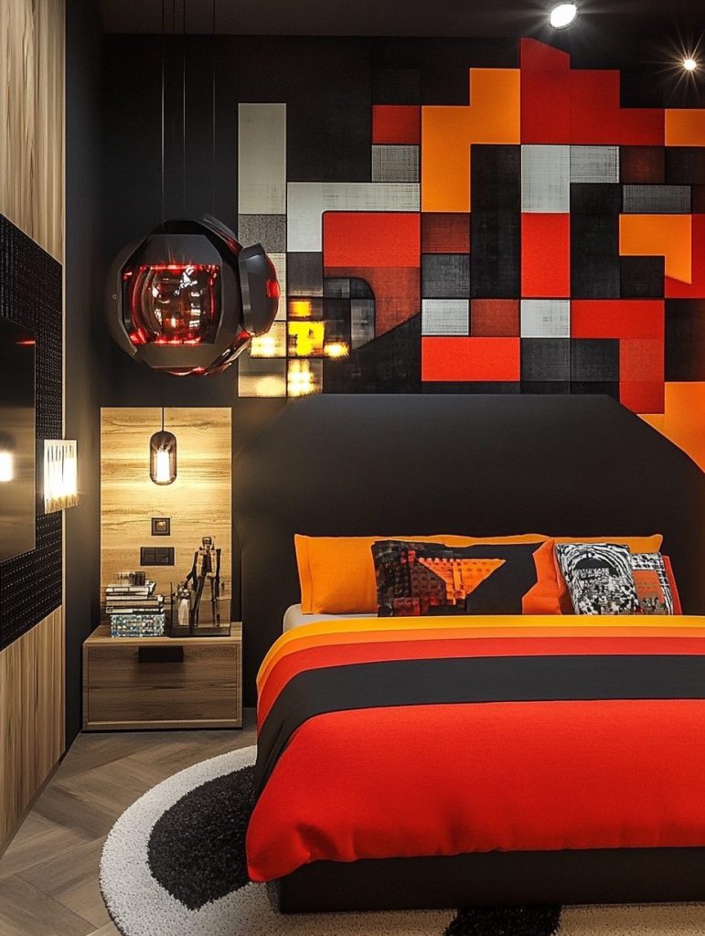 Furniture often mirrors these shapes with sharp lines, layered textures, and a modular feel. Bright accent colors—paired with a neutral base palette—make the shapes stand out, lending the room a sense of energy and movement. This theme works especially well for those who love modern decor with a creative twist, blending mathematical precision with Minecraft’s iconic design in a truly vibrant and forward-thinking space.