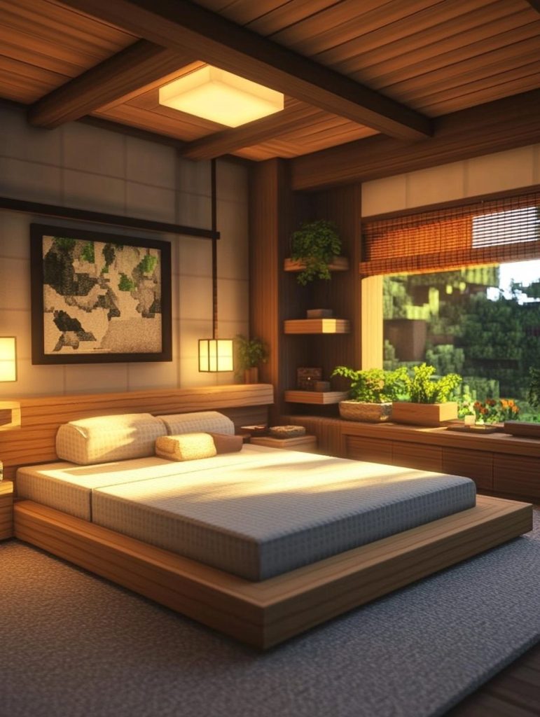 A Zen-inspired Minecraft bedroom is the epitome of serenity and balance, offering a peaceful sanctuary designed to calm the mind and soothe the senses. Rooted in minimalist principles, this style focuses on simplicity, intentionality, and a deep connection to natural elements. The color palette is composed of soft, tranquil shades—think muted greys, calming beiges, and pale greens—that evoke a sense of stillness and clarity.