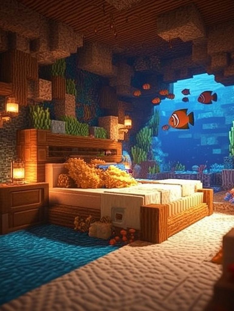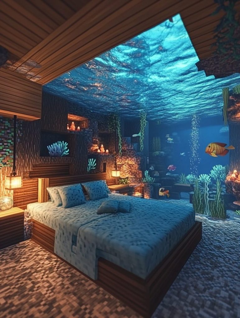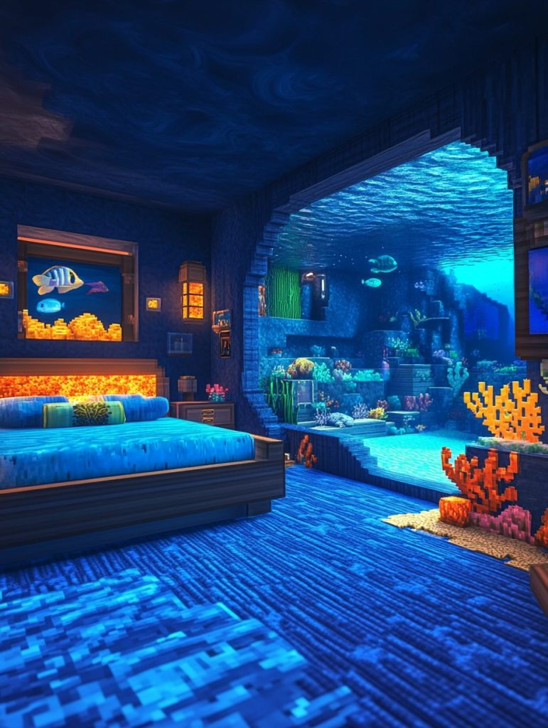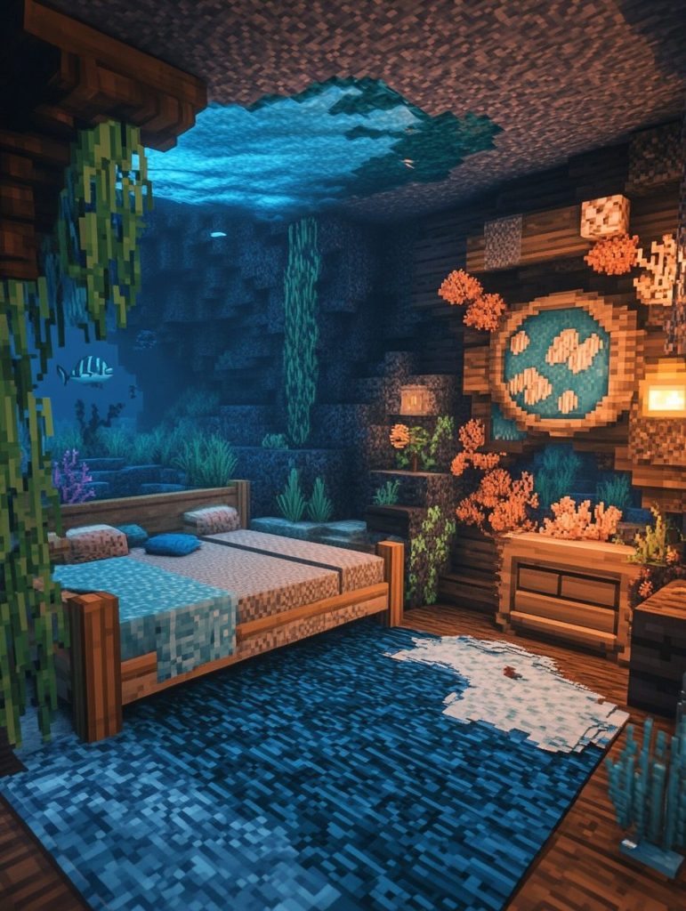 Enhance your imagination and creativity with an underwater-themed Minecraft bedroom—a captivating design that brings the serenity and mystery of the deep sea into your digital world. This immersive concept transforms your space into a tranquil aquatic retreat, filled with ocean-inspired visuals and textures that reflect the beauty of Minecraft’s watery realms.