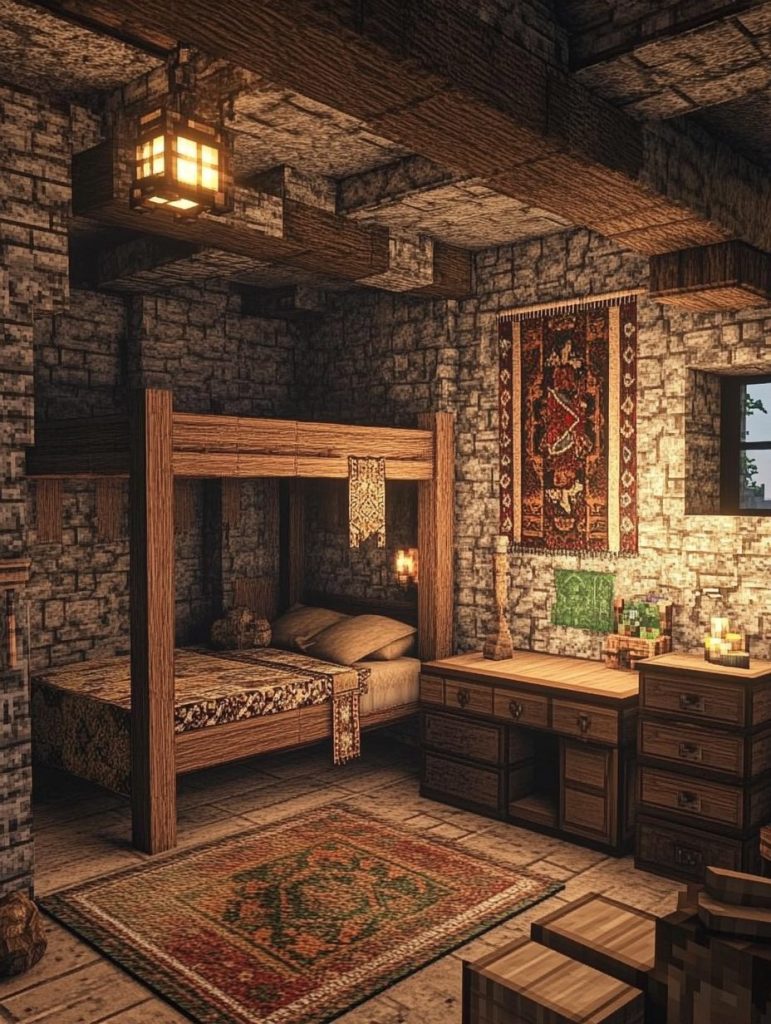 Perfect for those who enjoy lore, history, and immersive storytelling, this bedroom design serves as a portal to another era while still embracing Minecraft’s blocky brilliance.