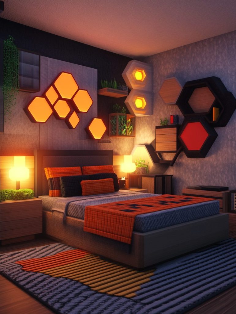 Walls can be enhanced with murals or decals showcasing angular patterns or pixelated grids, tying back to the blocky visual language of Minecraft. Patterned rugs featuring symmetrical or tessellated designs add depth to the floor, while hexagonal wall shelves provide both storage and visual interest.