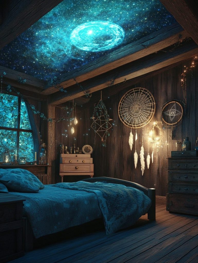 Crystal-inspired accents, shimmering textures, and decorative dreamcatchers can enhance the room’s spiritual and calming energy. Furniture pieces with curved lines, iridescent finishes, or nature-inspired shapes add a sense of magic and mystery.