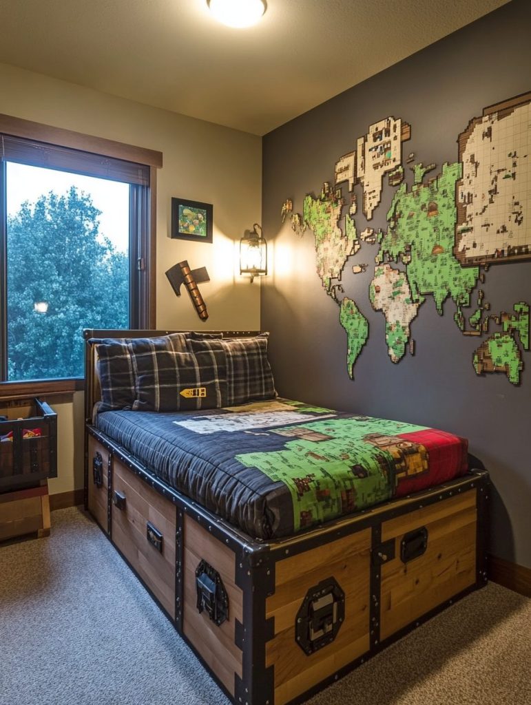A casual yet sturdy bed frame, a basic desk for creative play or study, and a few well-chosen decor pieces like a pixel-themed lamp or a subtle wall art can tie the entire look together. By keeping distractions to a minimum, this style allows the beauty of Minecraft’s geometric aesthetics to shine through, while offering a peaceful and practical space that encourages focus and calm. It’s a perfect balance between the digital world and real-life tranquility.