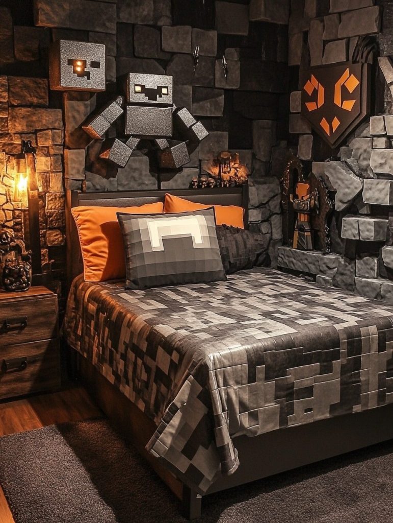 Cave-inspired bedding featuring pixelated ore blocks or stone patterns helps reinforce the theme, while stone slab-style shelving adds functionality without compromising on the rugged look. Decorative accents like mossy cobblestone, glowing mineral lamps, and ore-themed wall hangings (inspired by diamonds, emeralds, or redstone) tie everything together.