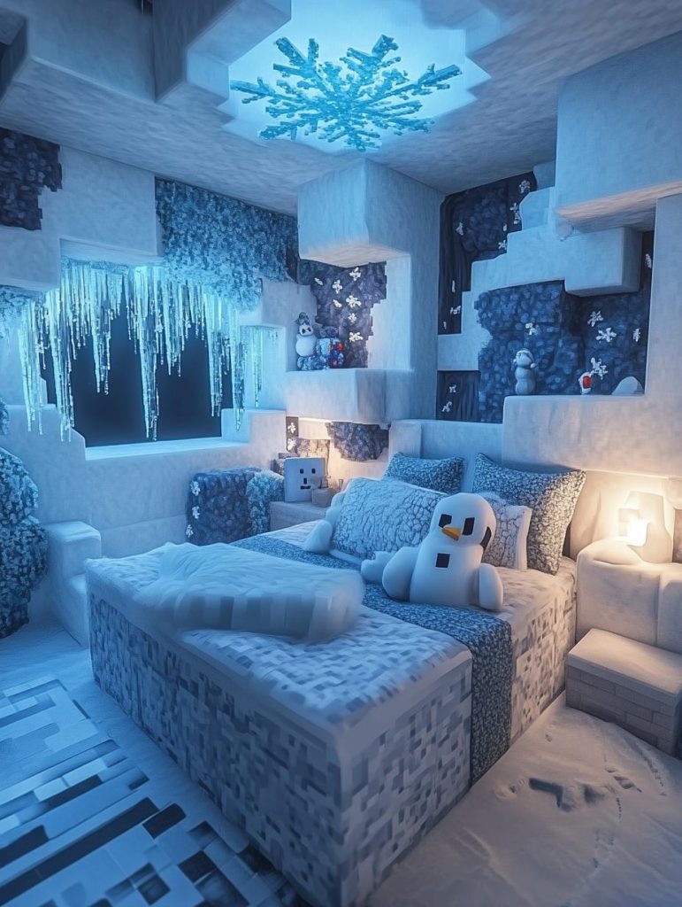 Frosted lighting—whether in the form of LED snowflake lamps or soft blue accent lights—enhances the frozen vibe while keeping the atmosphere welcoming. Additional decor such as snowman figurines, winter-themed wall art, and cool-toned accessories help complete the look. Perfect for fans who love the peaceful beauty of snow-covered landscapes, this bedroom design feels both playful and invigorating—a true Minecraft-inspired winter escape.