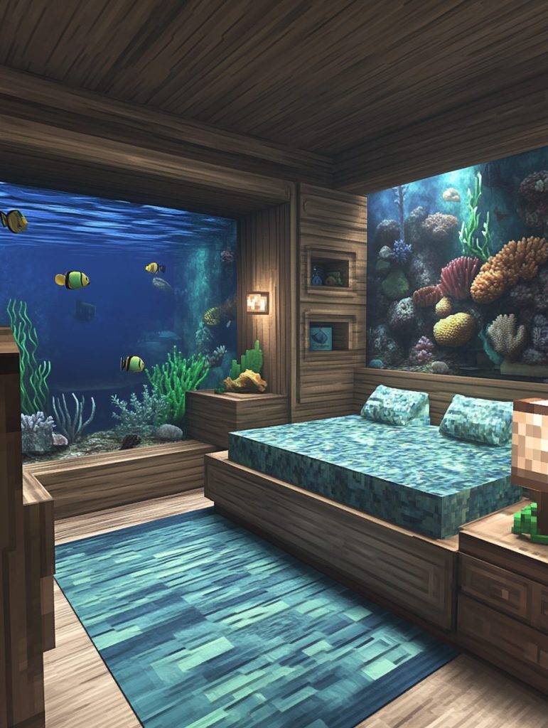 Transform your Minecraft bedroom into a stunning underwater world with an ocean aquarium theme that bursts with vibrant colors and marine-inspired charm. This immersive design style captures the essence of life beneath the sea, surrounding you with aquatic decor and furniture that mimics the textures and tones of the ocean floor.