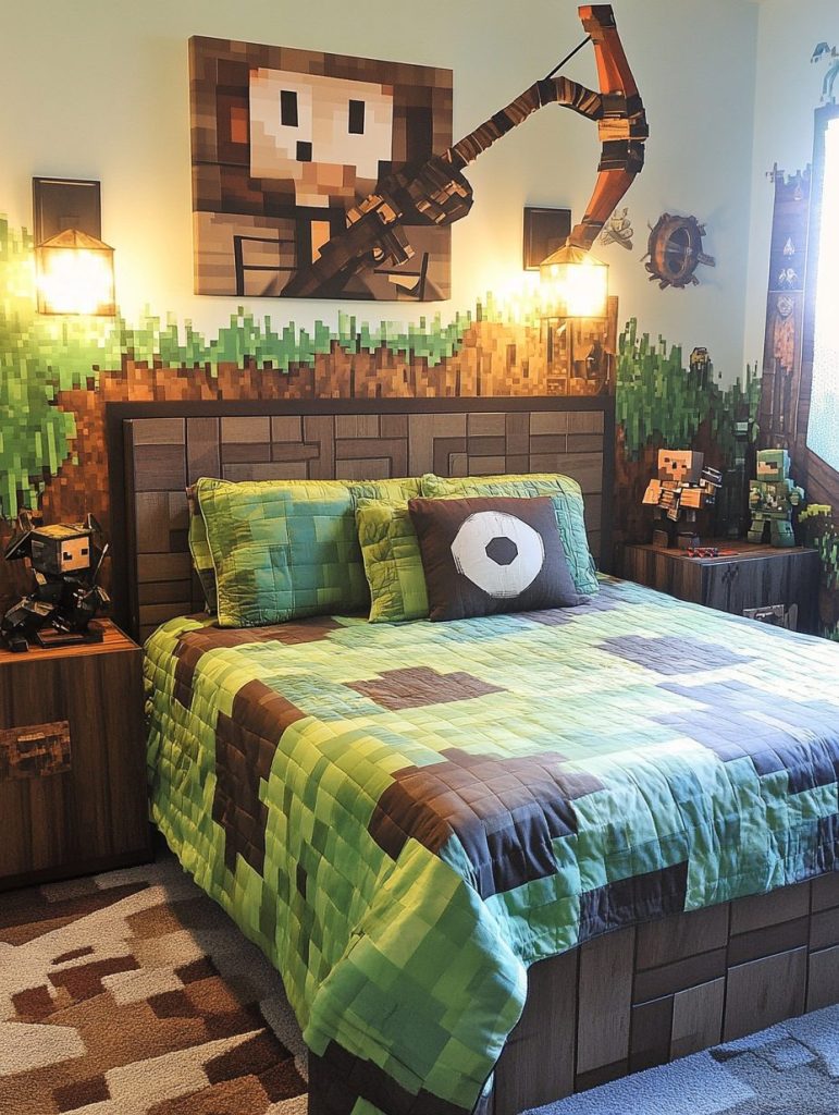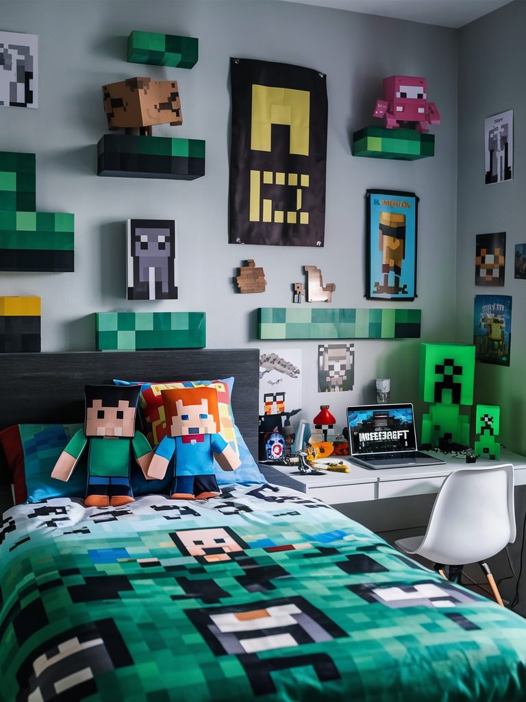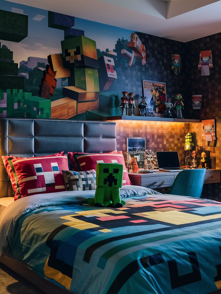 The decor might include whimsical character-themed bedding, cartoonish wall art, or multi-colored rugs that bring a sense of animation and energy to the space. Add-ons like hanging mobiles, oversized plush toys, or floating shelves in irregular shapes can further enhance the fantasy-like ambiance. Minecraft-themed elements—such as villager prints, creeper cushions, or block-shaped lamps—can be scattered throughout to keep the game’s charm alive.
