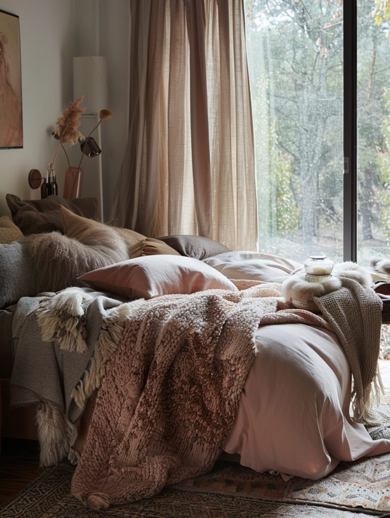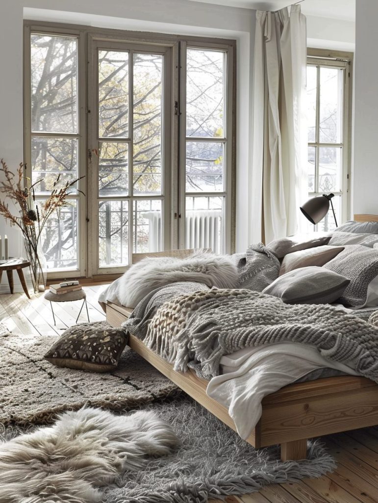 Layering different textiles is a great way to infuse warmth and coziness into a modern bedroom. Mixing various fabrics—such as soft throws, plush rugs, and a variety of pillows—adds texture and depth, making the space feel more inviting and comfortable.
