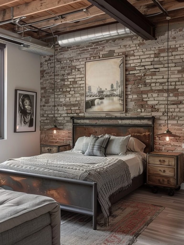Industrial bedrooms merge rugged materials with a hint of modern elegance. This style brings together exposed brick walls, metal furniture, and rustic wooden accents to create a balanced and visually striking space.