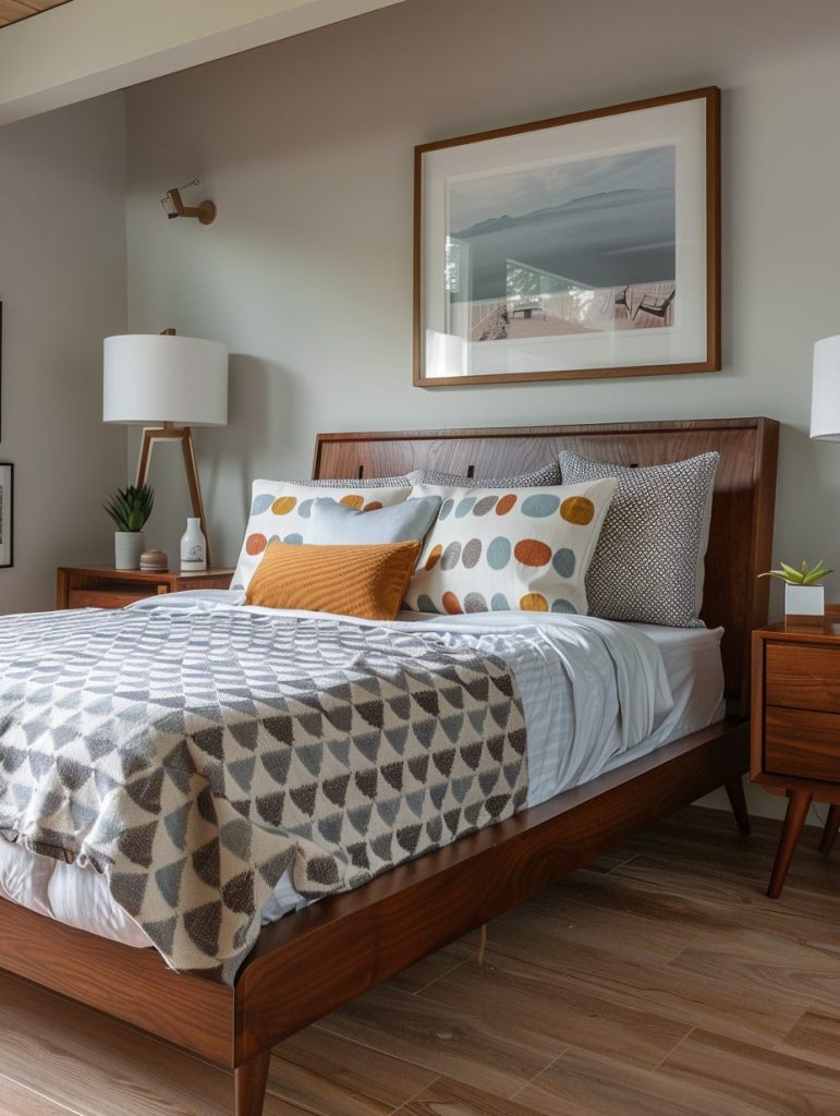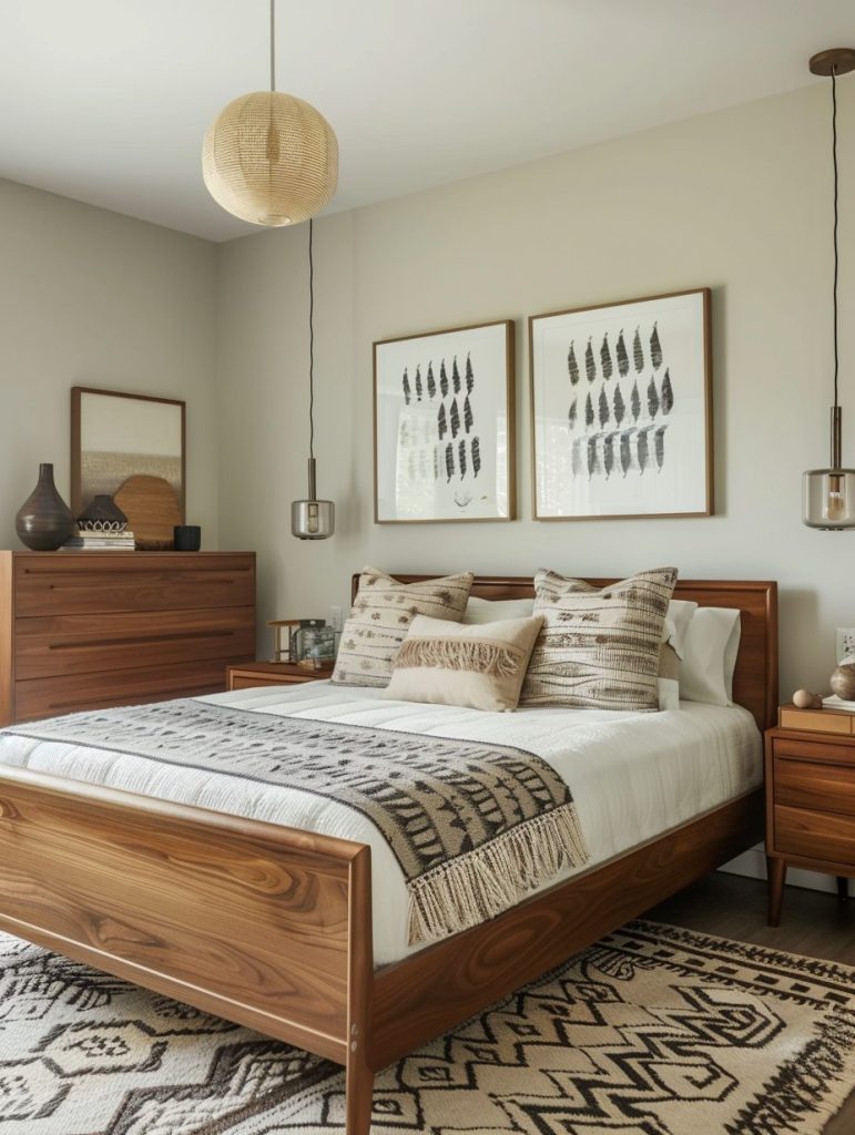 Mid-century modern style is easily identified by its clean lines, smooth organic curves, and a strong focus on functionality. What sets this design apart is its blend of both classic and unconventional materials, which together create a timeless yet modern bedroom aesthetic.