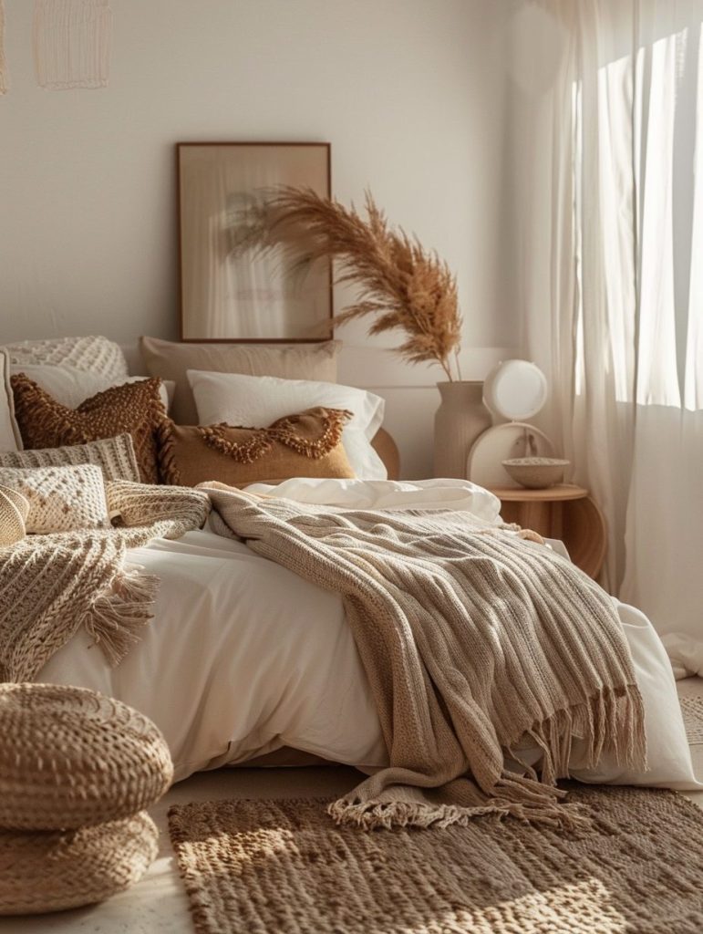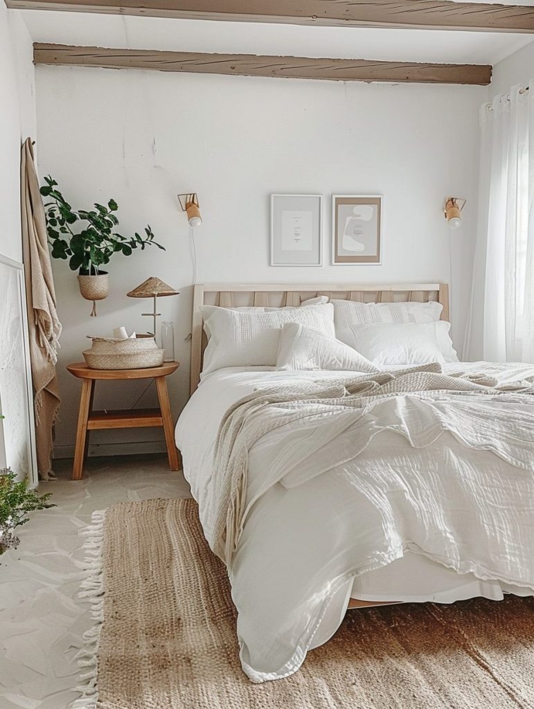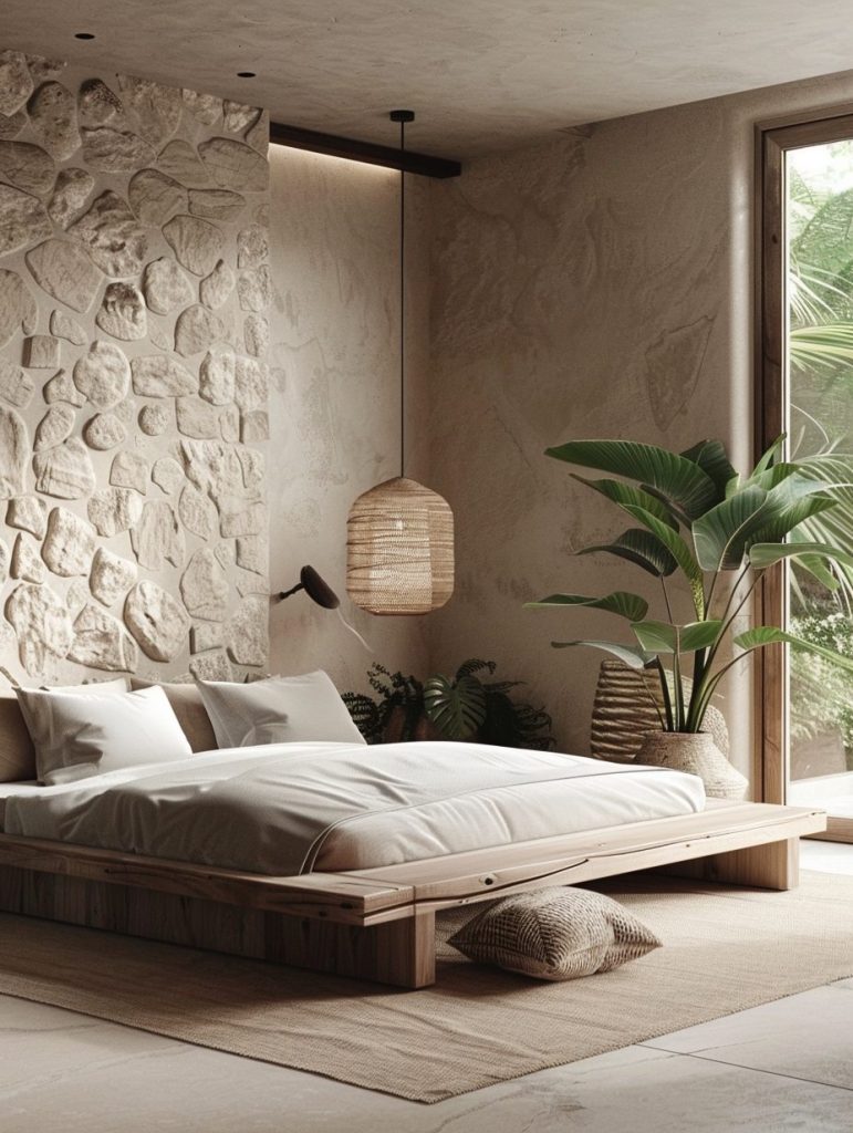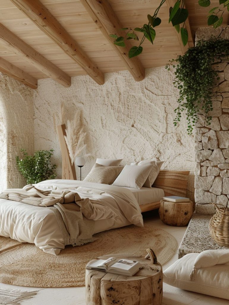 A nature-inspired bedroom brings a sense of calm and freshness to your space. Incorporate natural elements like wood, stone, linen, and plenty of greenery to create a soothing environment.