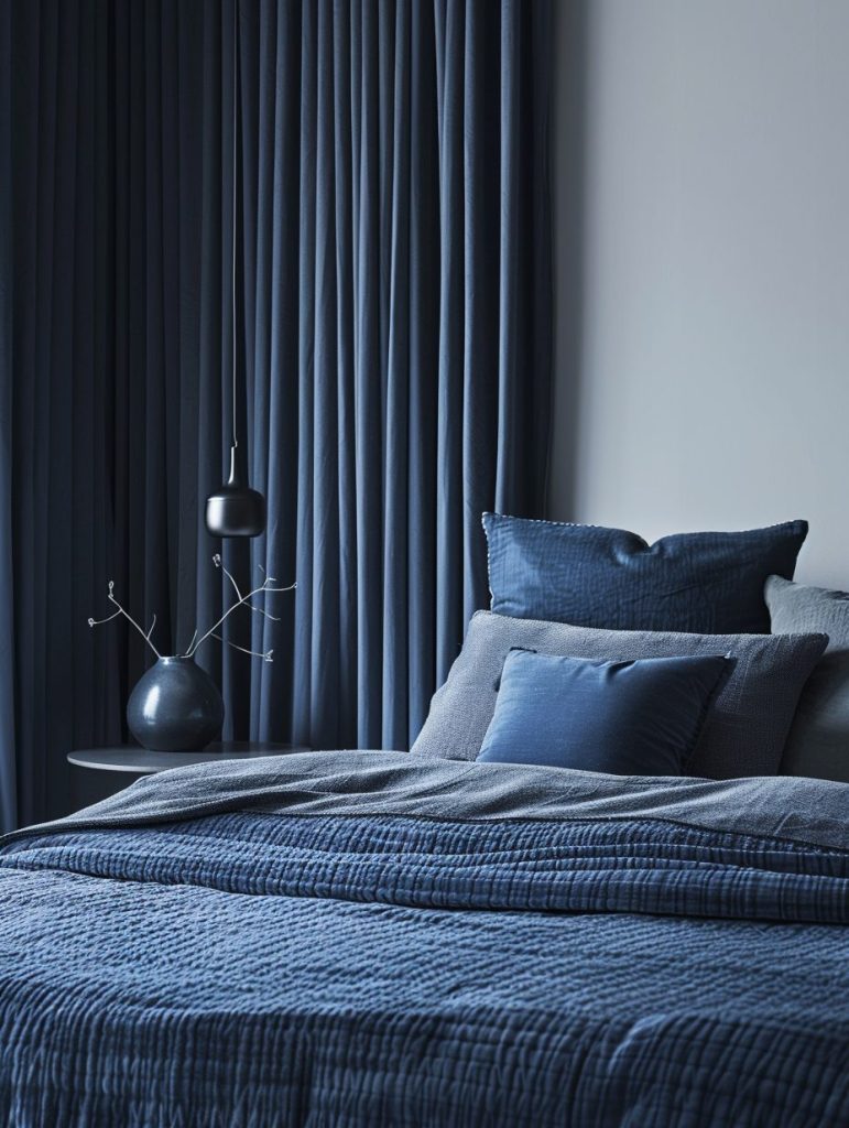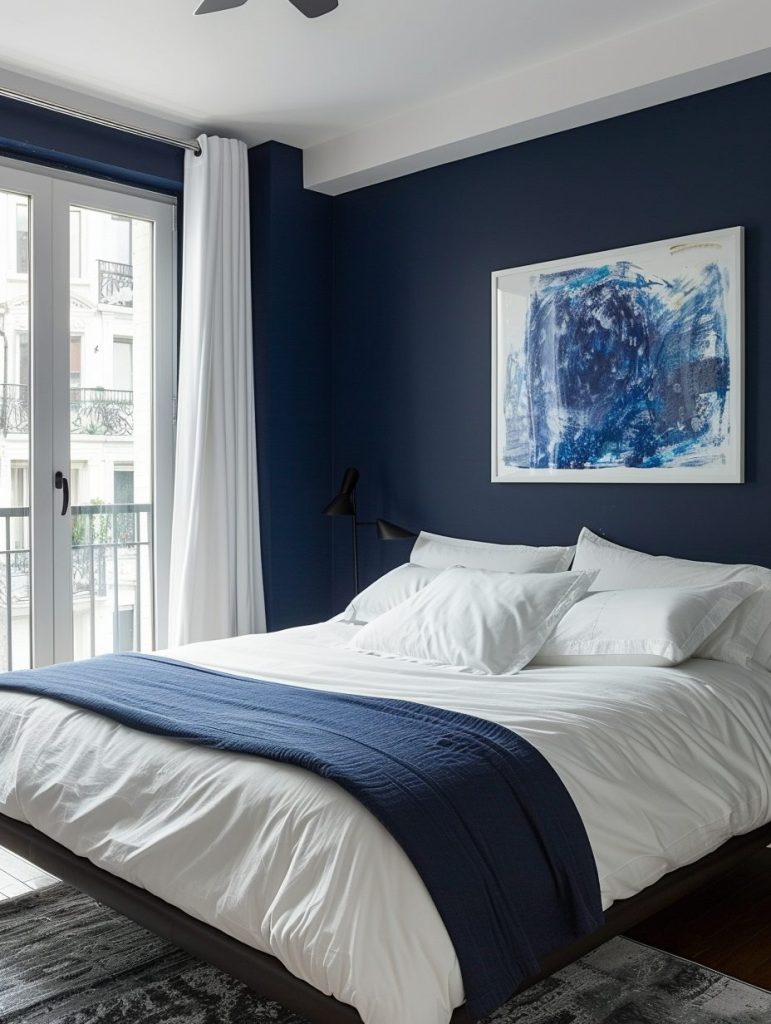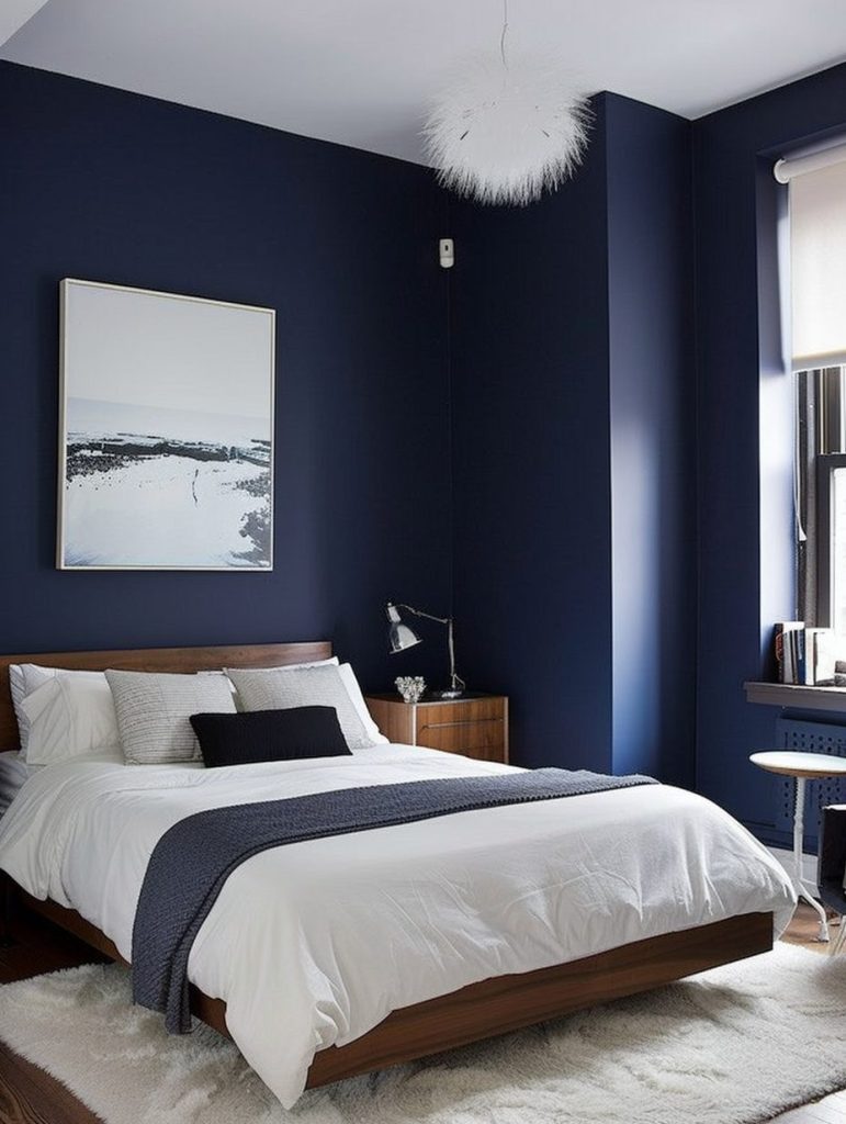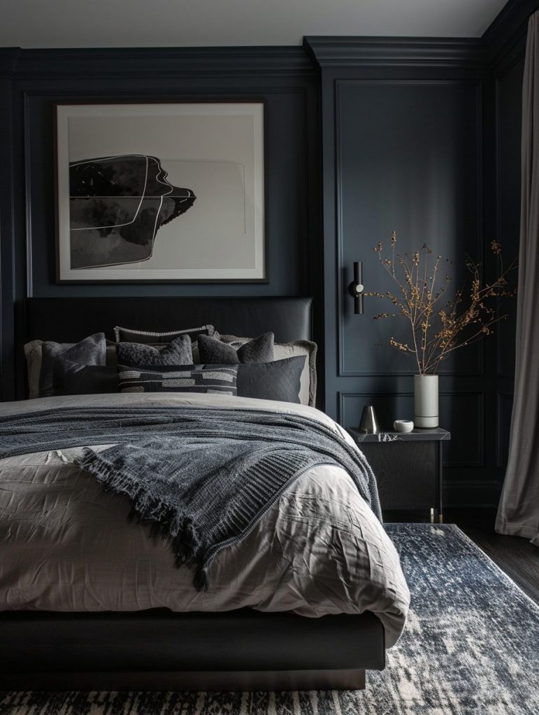 Dark, enclosed spaces can bring a dramatic yet cozy vibe to a modern bedroom. Deep shades like navy blue, charcoal gray, and black add richness and sophistication. To prevent the room from feeling too heavy, balance the darkness with lighter elements and textured surfaces, creating a well-rounded and visually engaging environment.