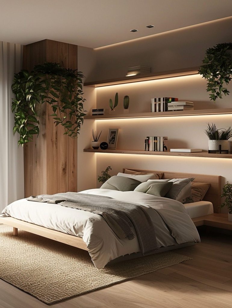 Floating shelves are a stylish and practical addition to any modern bedroom. They offer extra storage without taking up floor space, making them especially ideal for smaller rooms. Use them to display art, books, decorative items, or even a few potted plants—adding both functionality and personality to your space.