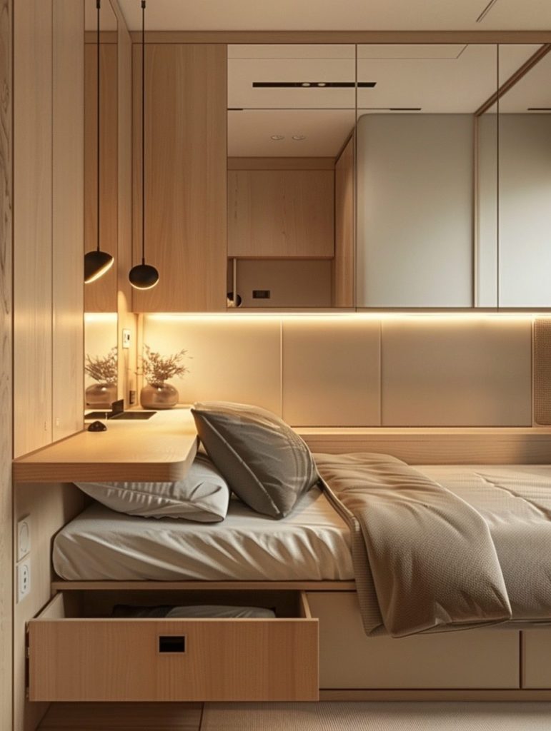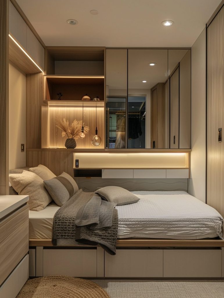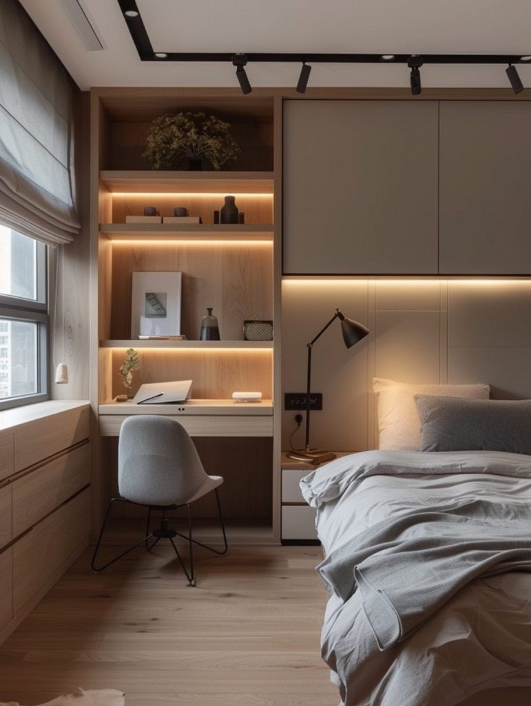 Incorporating multifunctional furniture—like beds with built-in drawers, wall-mounted shelves, and custom closets—helps optimize every inch of the room while maintaining a sleek and organized look.