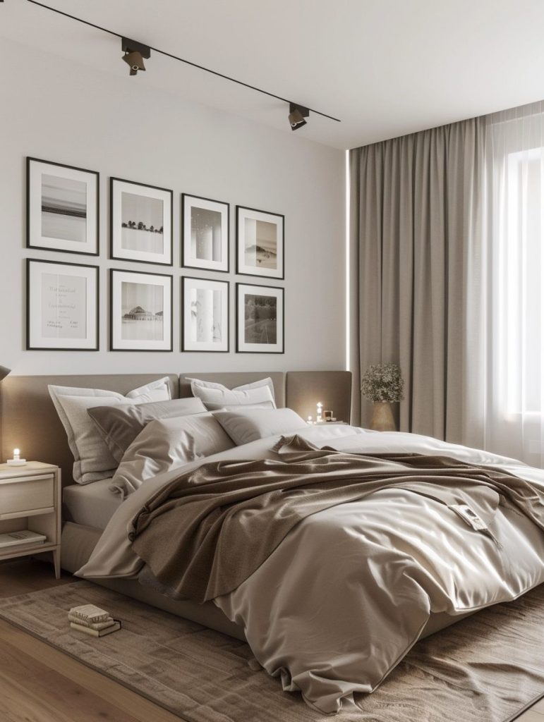 Creating a personalized gallery wall with your favorite artwork, photos, and keepsakes is a fantastic way to add character to your bedroom. Arrange the pieces in a visually appealing layout and align the frames for a clean, cohesive appearance.