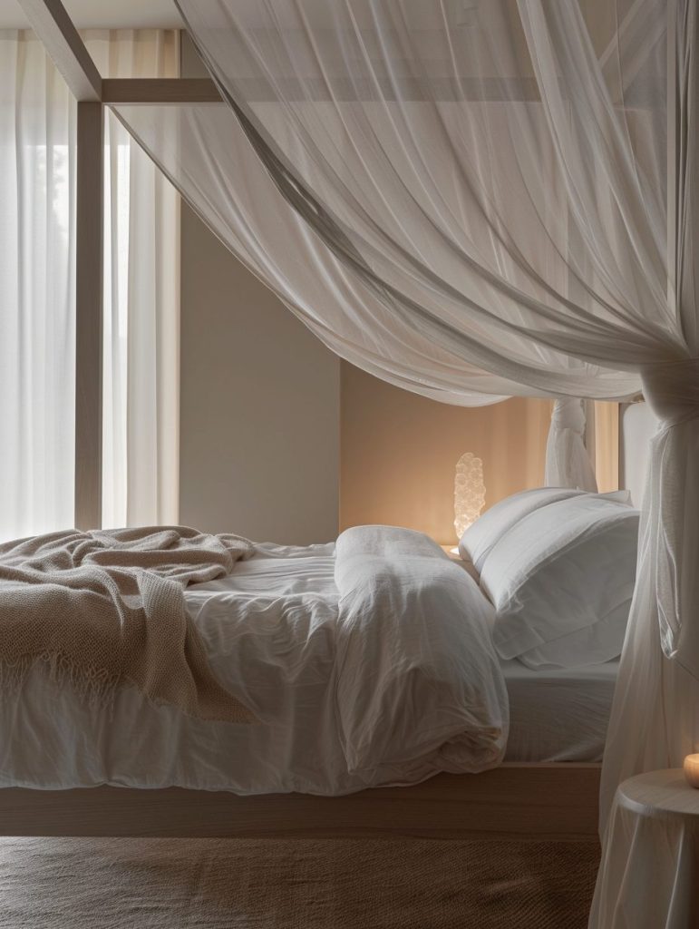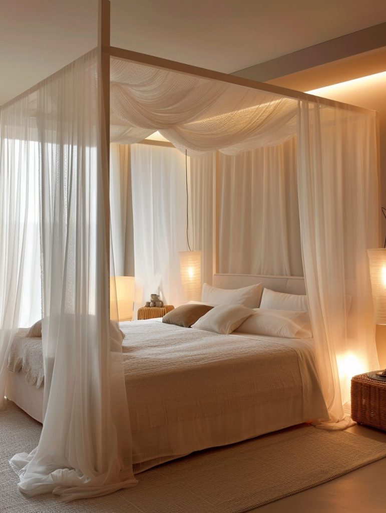Soft, flowing curtains draped over the canopy enhance the cozy, intimate feel, turning your bedroom into a serene and luxurious retreat.