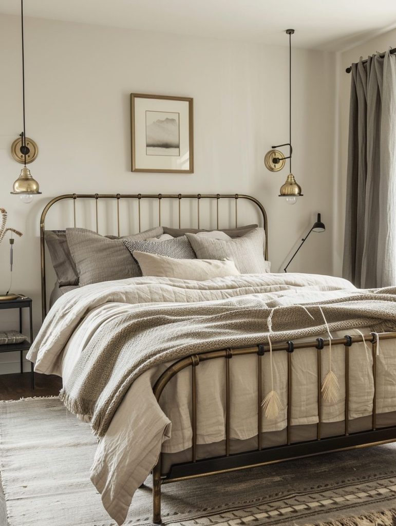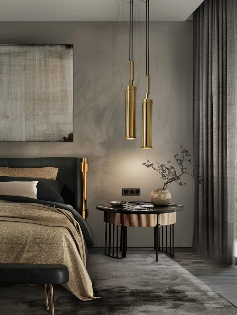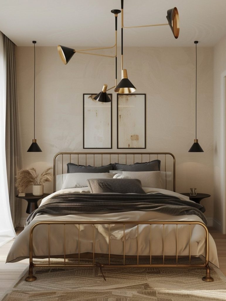 Incorporate elements like metal bed frames, lighting fixtures, or decorative pieces in stylish finishes such as brass, gold, or matte black.