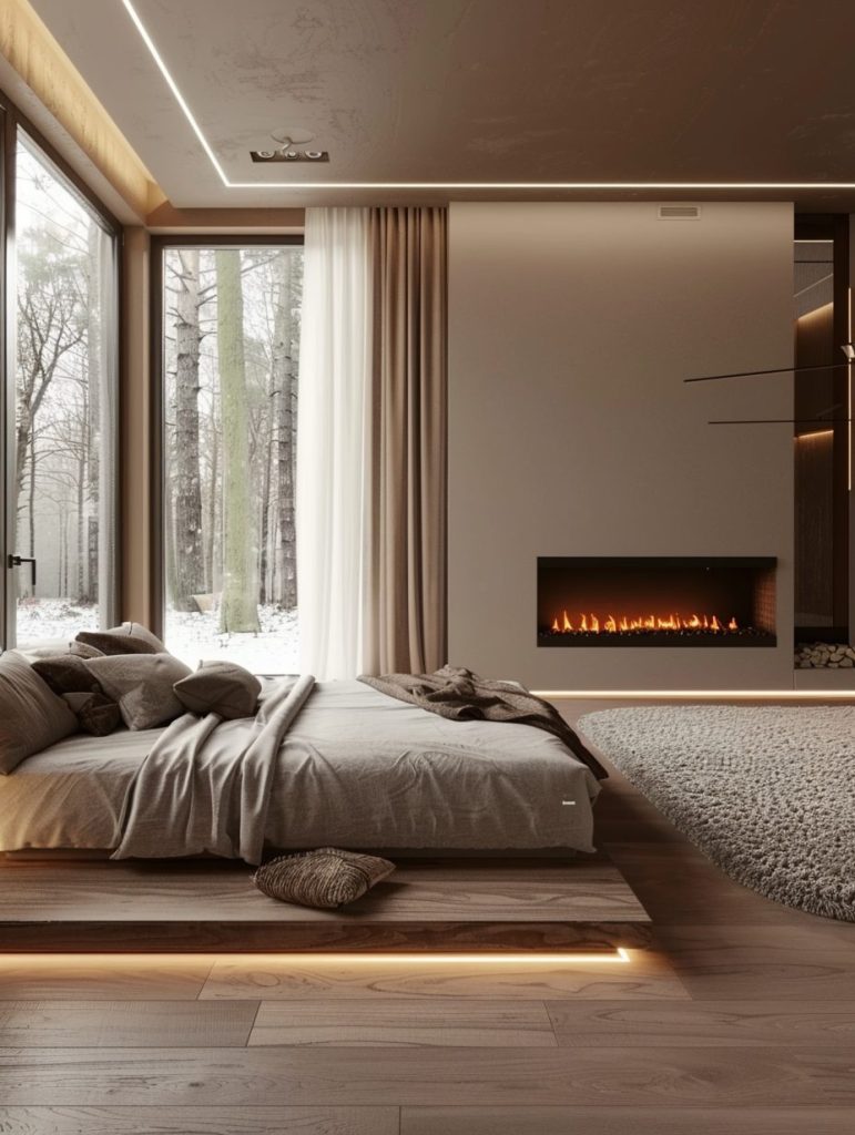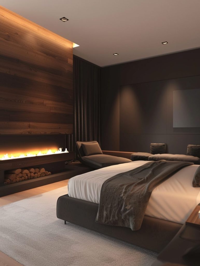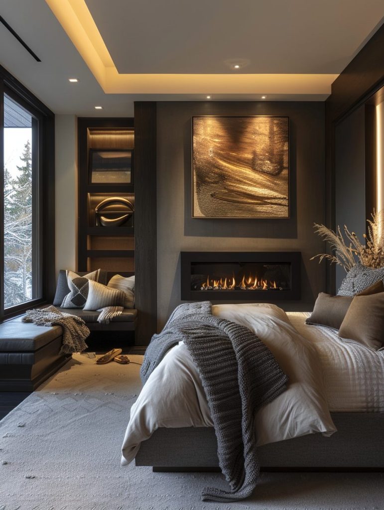 A fireplace adds a perfect blend of warmth and comfort to a modern bedroom.