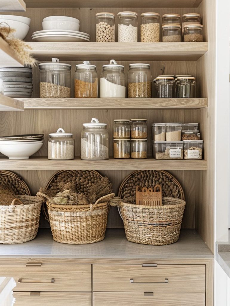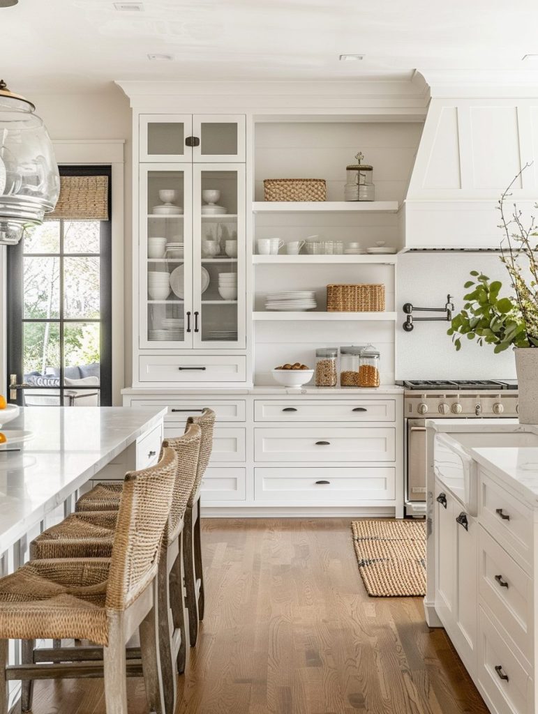 Accents like woven baskets, glass jars, and natural fabrics add texture and warmth, enhancing the overall aesthetic.
