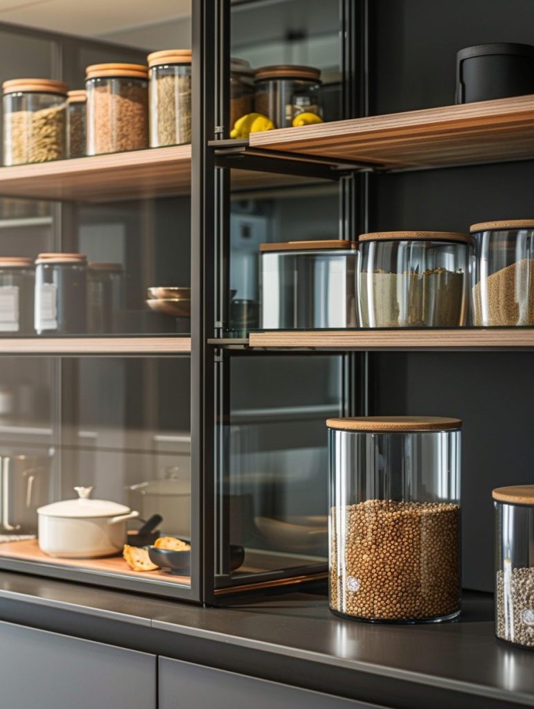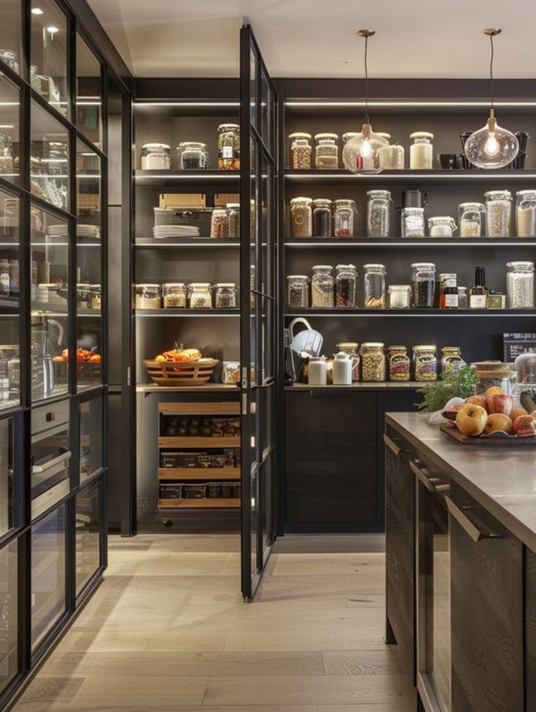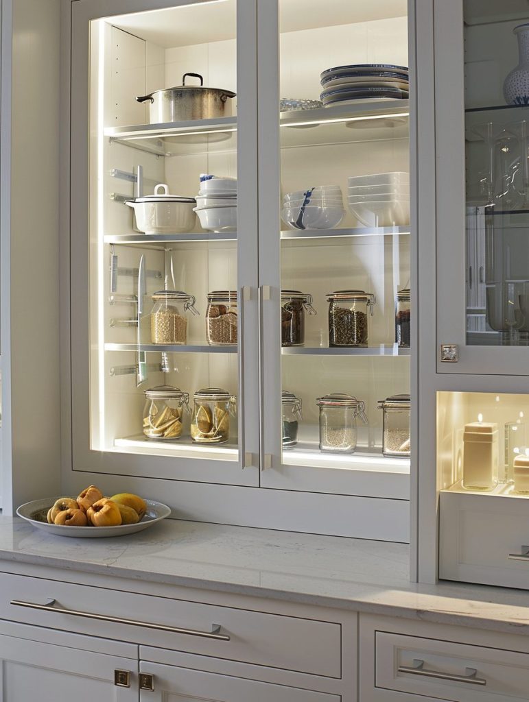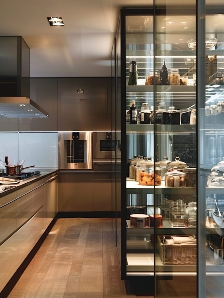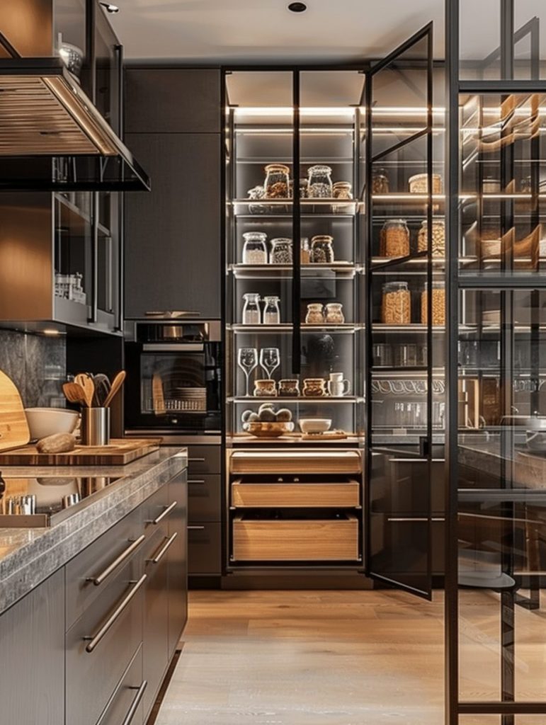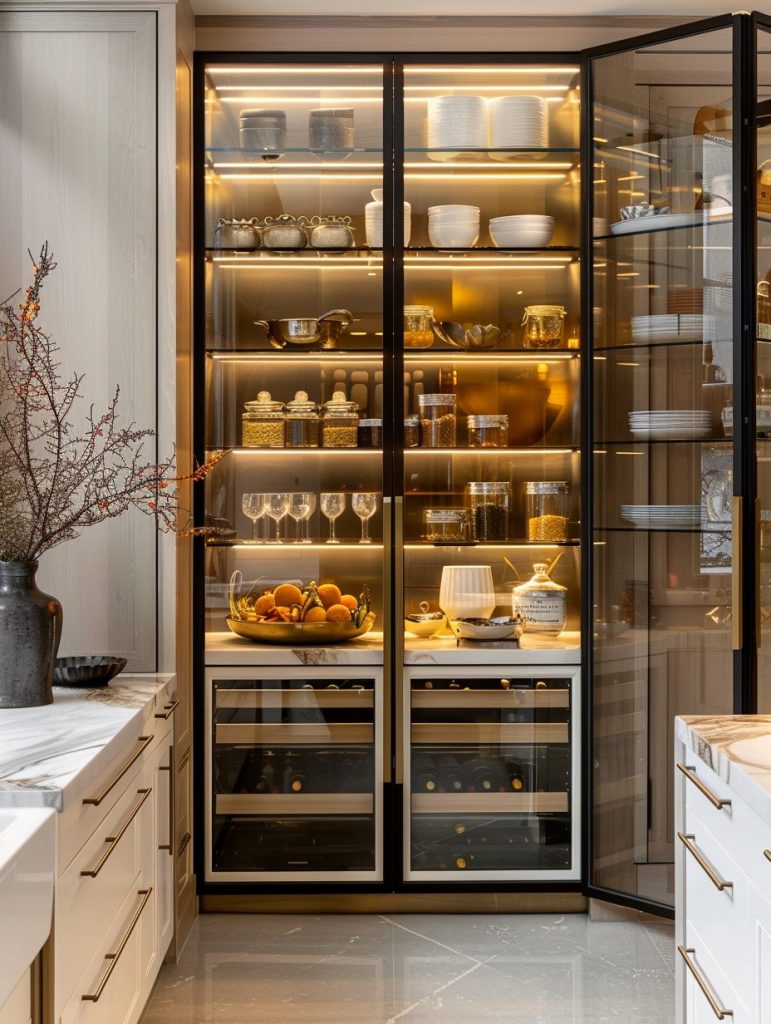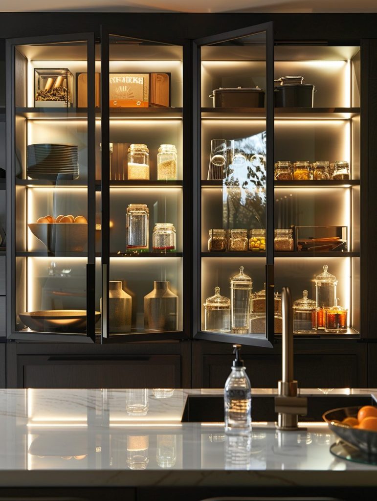 Glass-encased pantry cabinets offer a chic and contemporary solution for both storing and displaying your kitchen essentials.