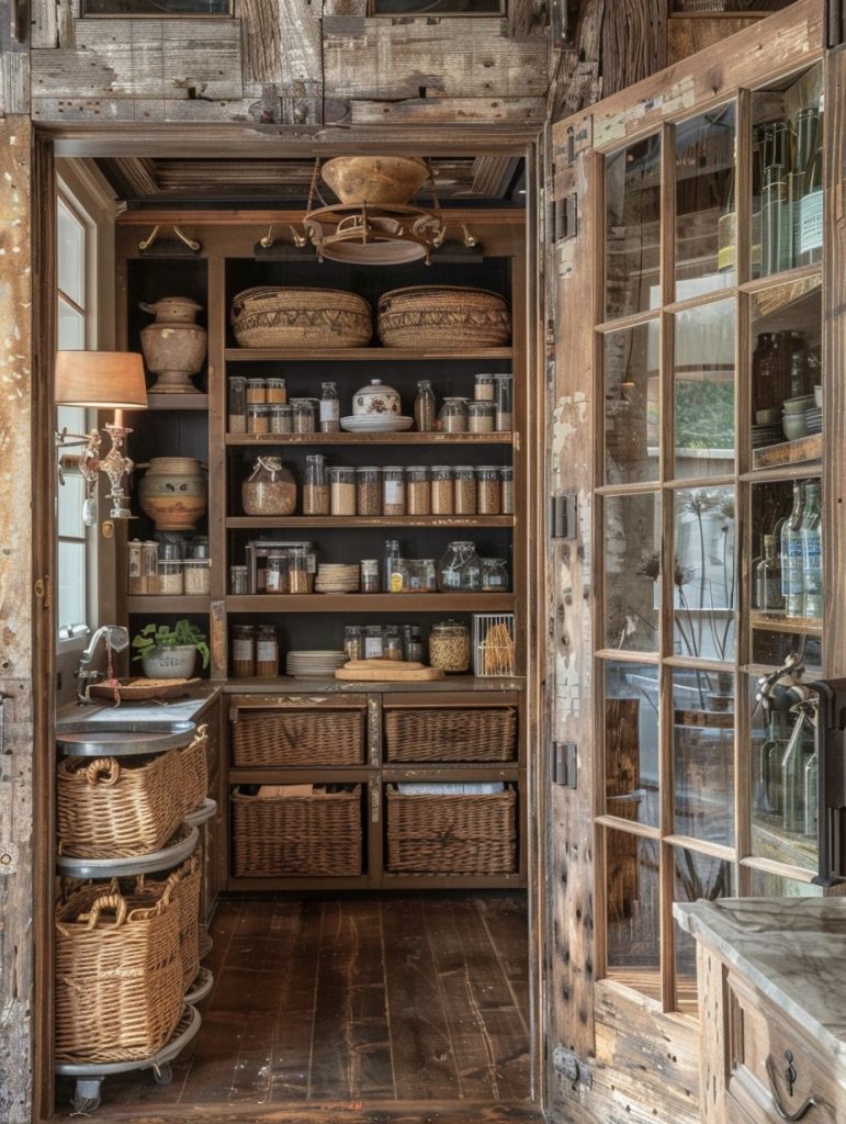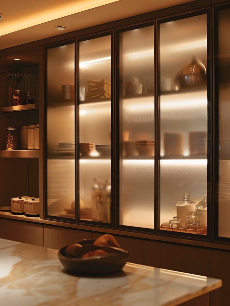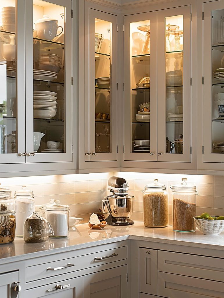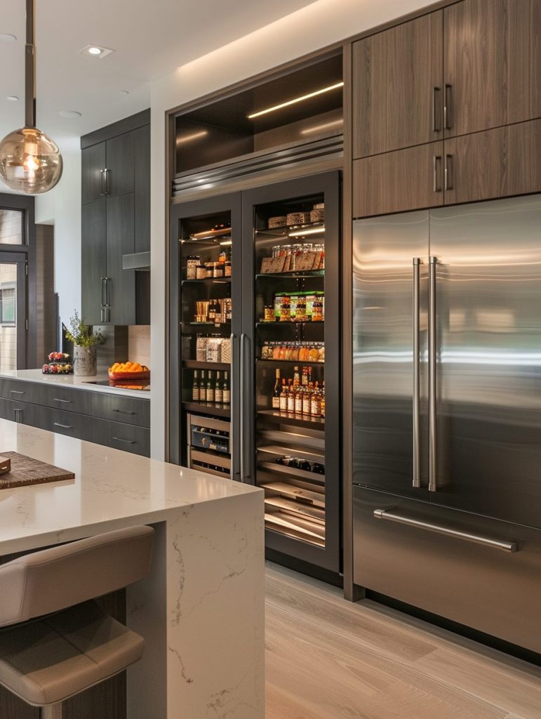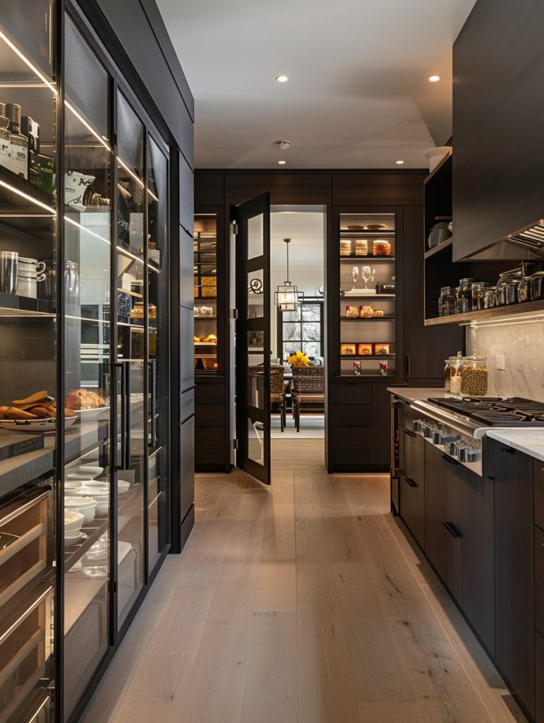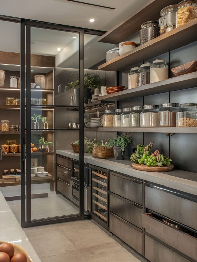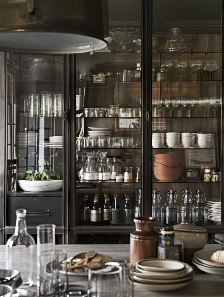 Glass-encased pantry cabinets offer a chic and contemporary solution for both storing and displaying your kitchen essentials.