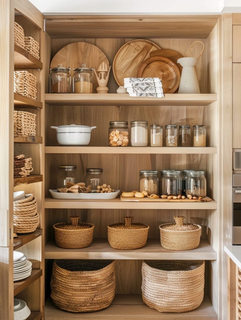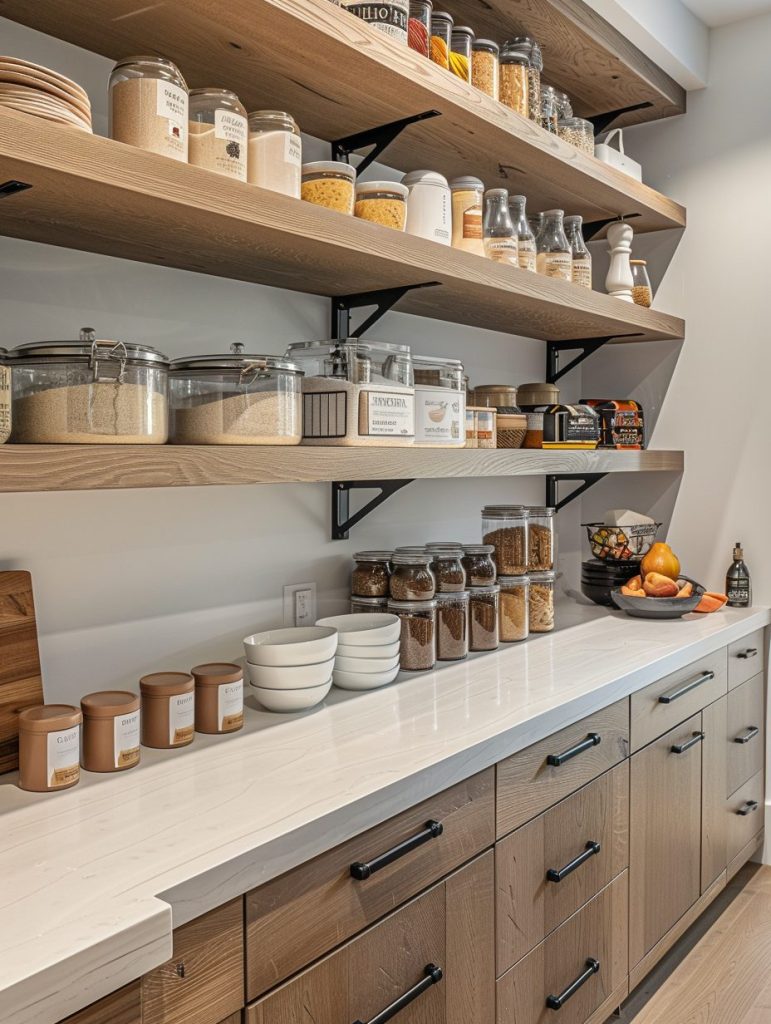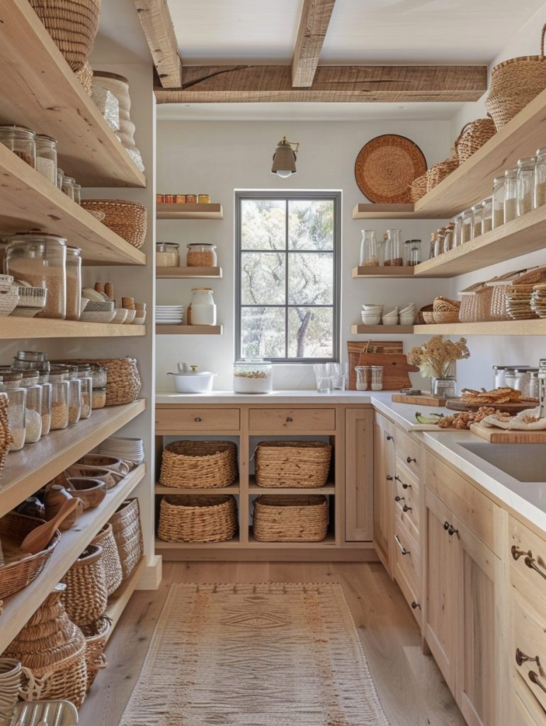 Scandinavian-inspired pantry design is all about simplicity, functionality, and a connection to nature. These designs typically feature light wood finishes, clean lines, and open shelving, creating a bright and airy atmosphere.