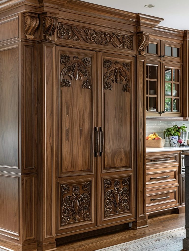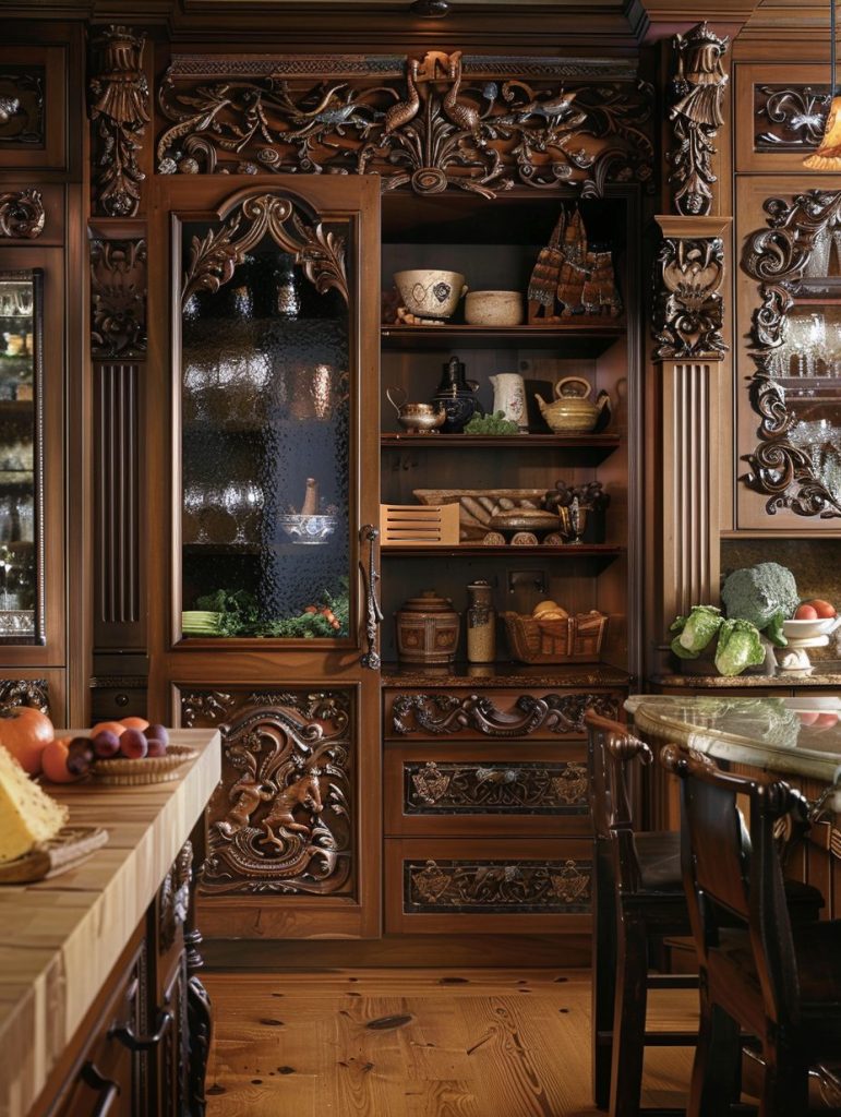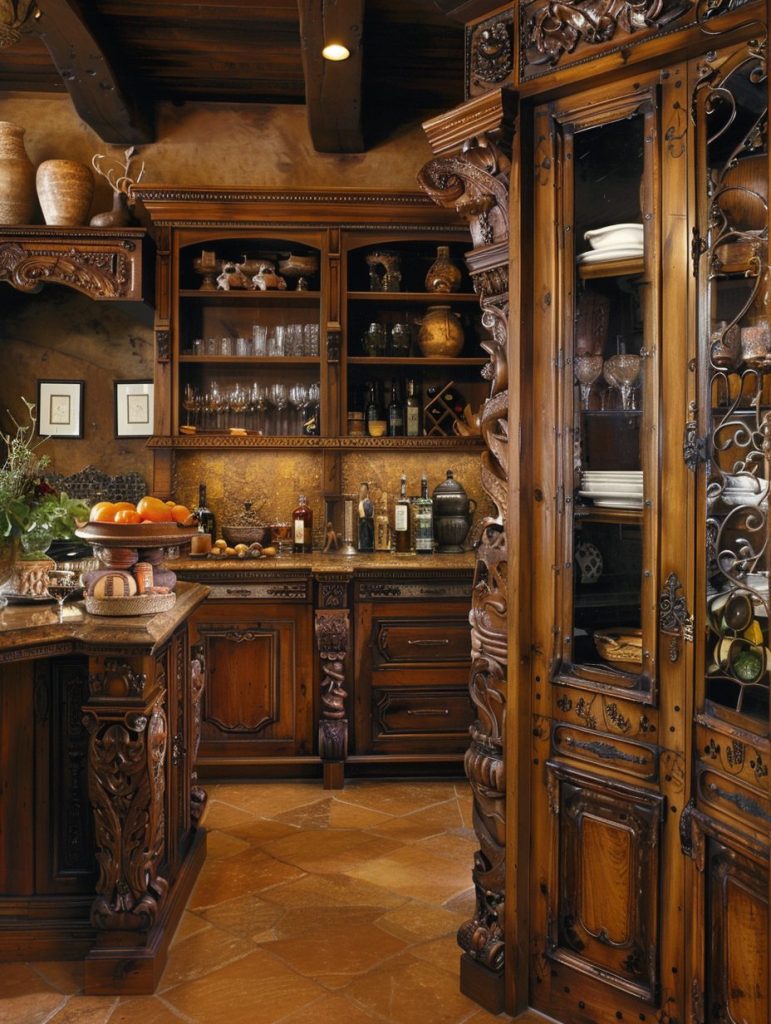 Tuscan pantry designs bring the inviting warmth and rustic elegance of the Italian countryside into your kitchen. These cabinets often showcase rich, dark wood finishes, intricate hand-carved details, and distinctive hardware.