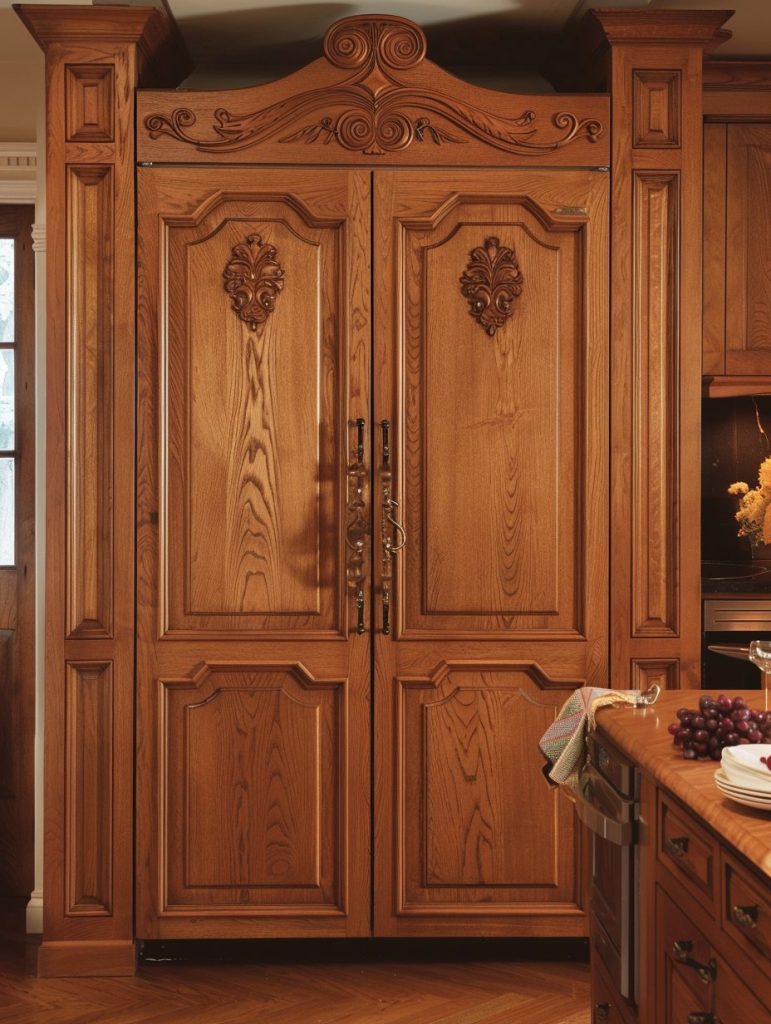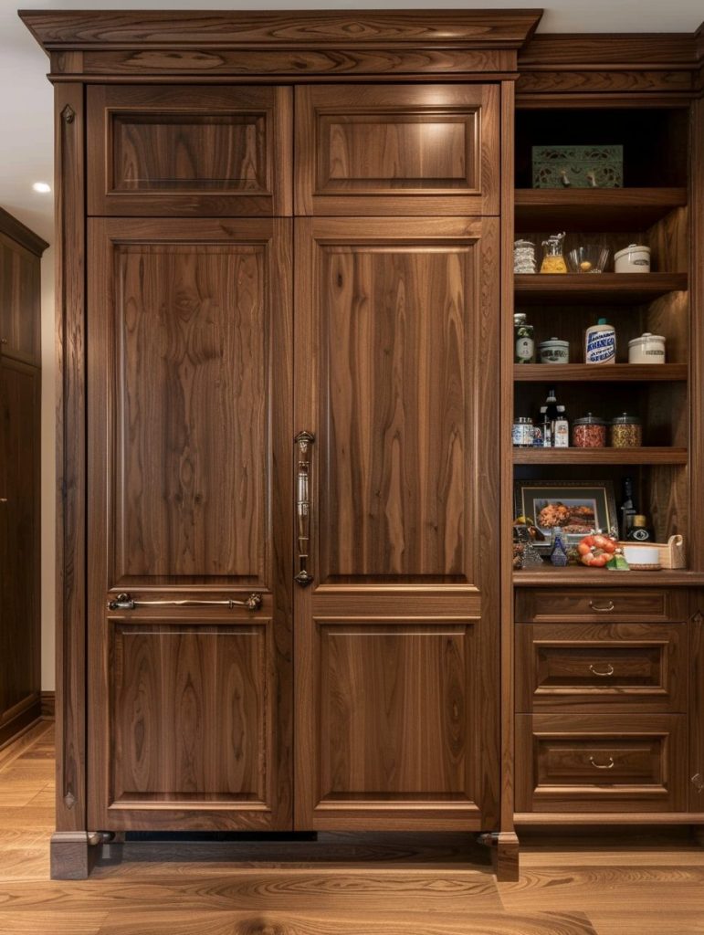 Traditional wooden pantry cabinets bring a warm, vintage charm to the kitchen. Crafted from sturdy, high-quality woods like oak, cherry, or walnut, these cabinets are built to last.