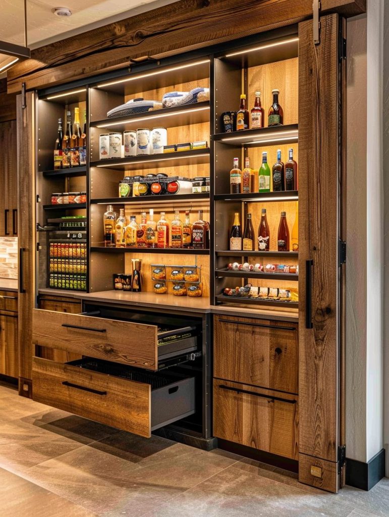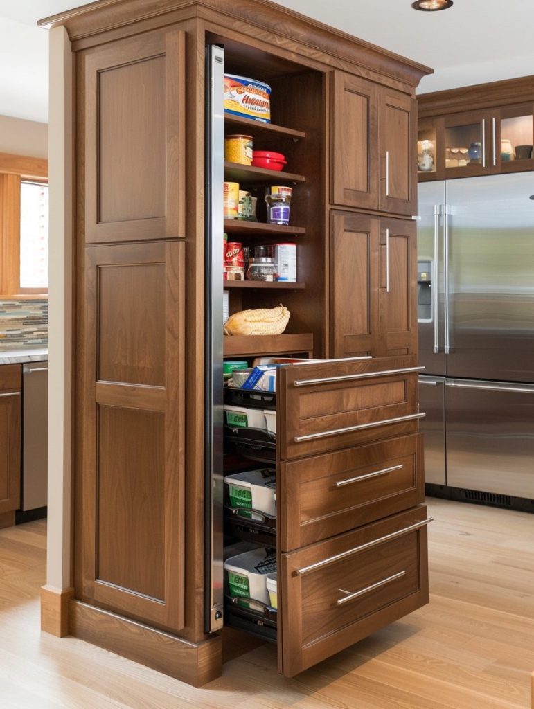 Space-saving pull-out pantries are designed to make the most of limited kitchen space. These clever cabinets feature pull-out shelves and drawers that allow easy access to items stored deep inside, ensuring nothing gets lost or wasted.