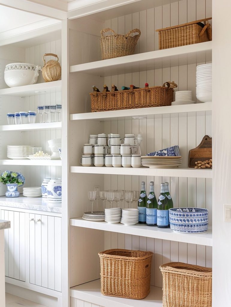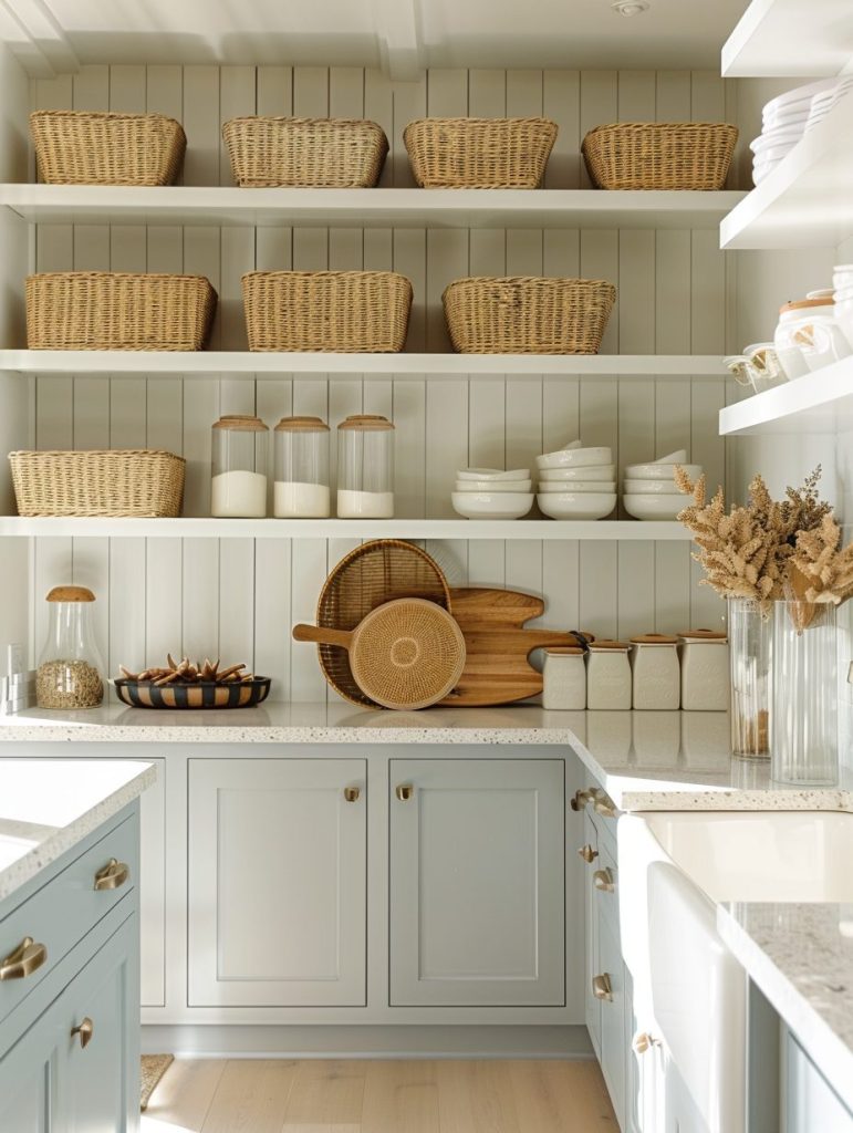 Key elements include open shelving, beadboard panels, and accents like wicker baskets.