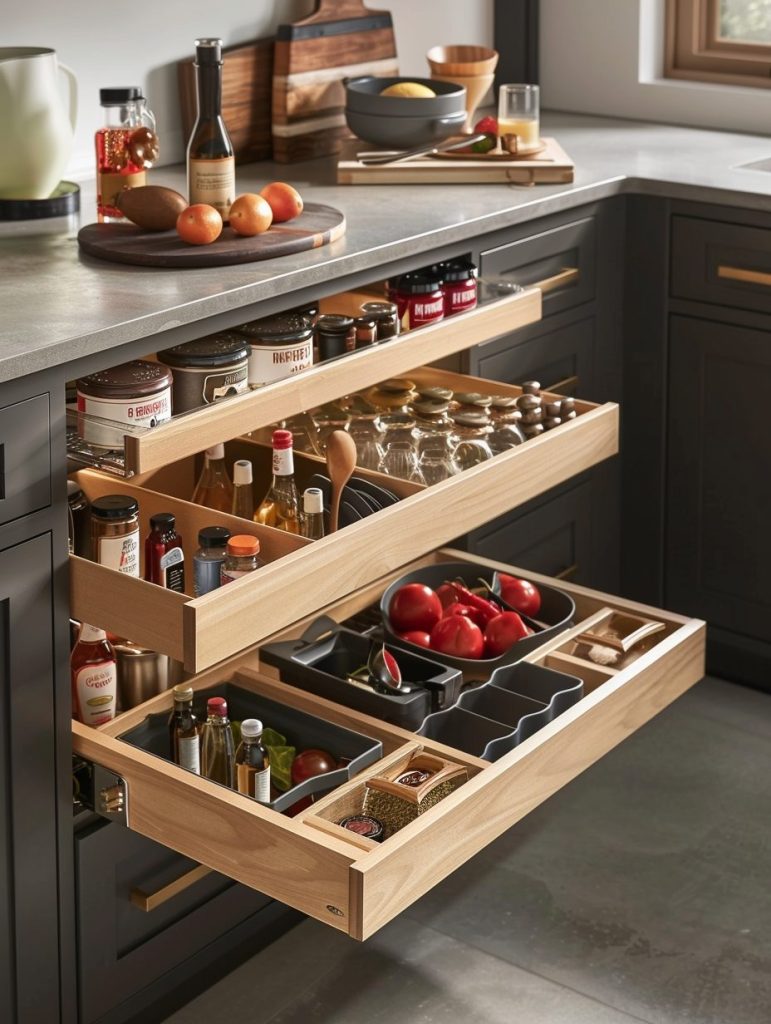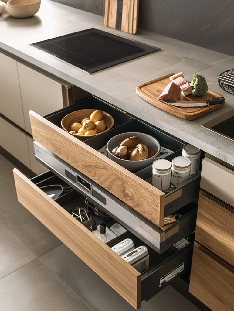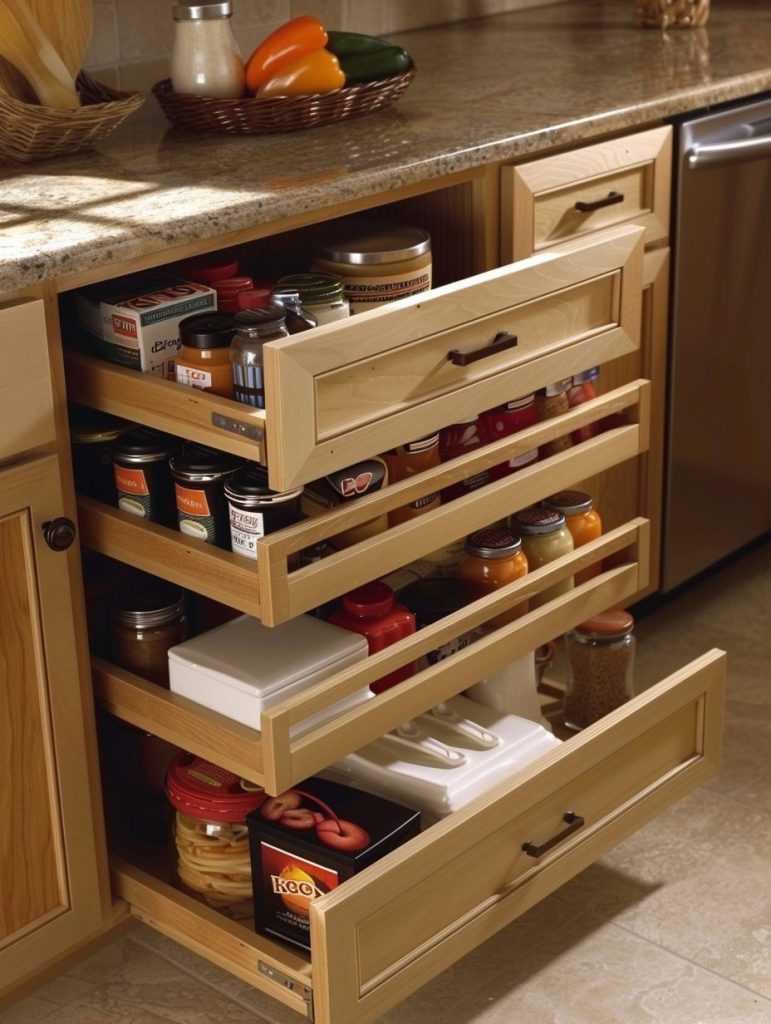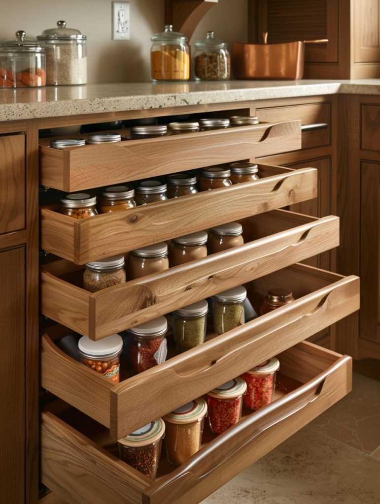 Space-efficient pantry drawers are designed to deliver compact, organized storage within limited kitchen areas. These drawers often feature pull-out mechanisms, tiered compartments, and tailored dividers that help maintain a neat and accessible pantry setup.
