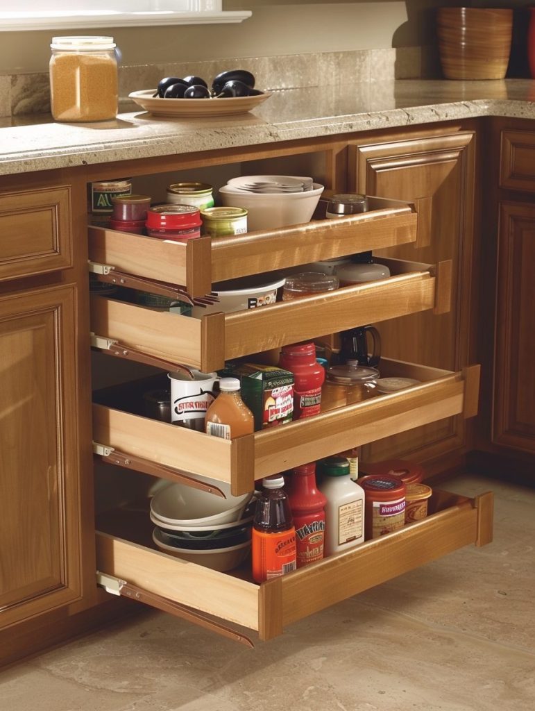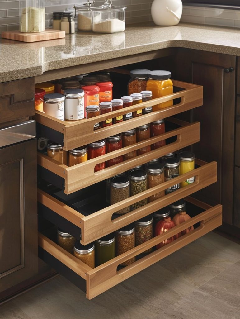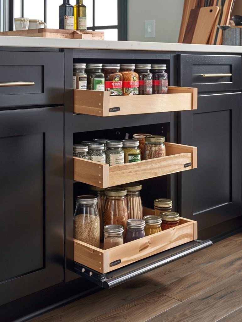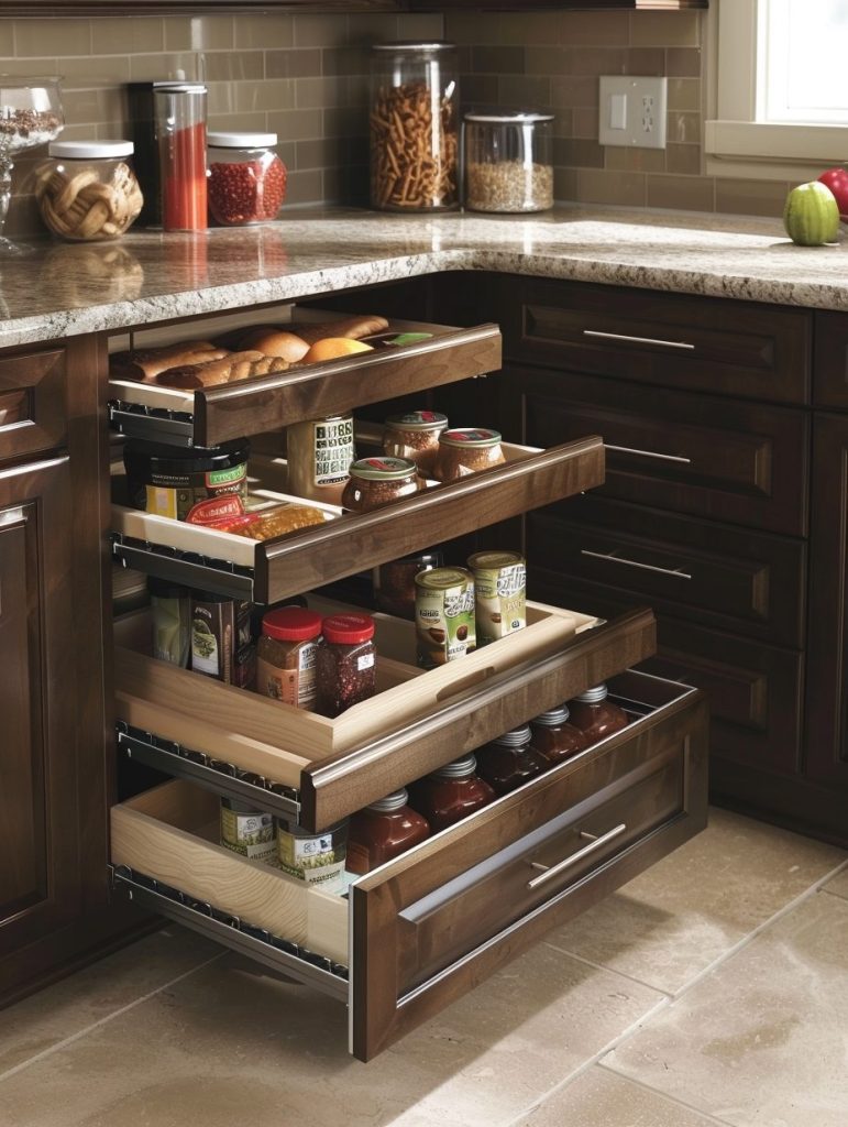 Space-efficient pantry drawers are designed to deliver compact, organized storage within limited kitchen areas. These drawers often feature pull-out mechanisms, tiered compartments, and tailored dividers that help maintain a neat and accessible pantry setup.
