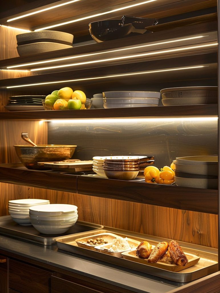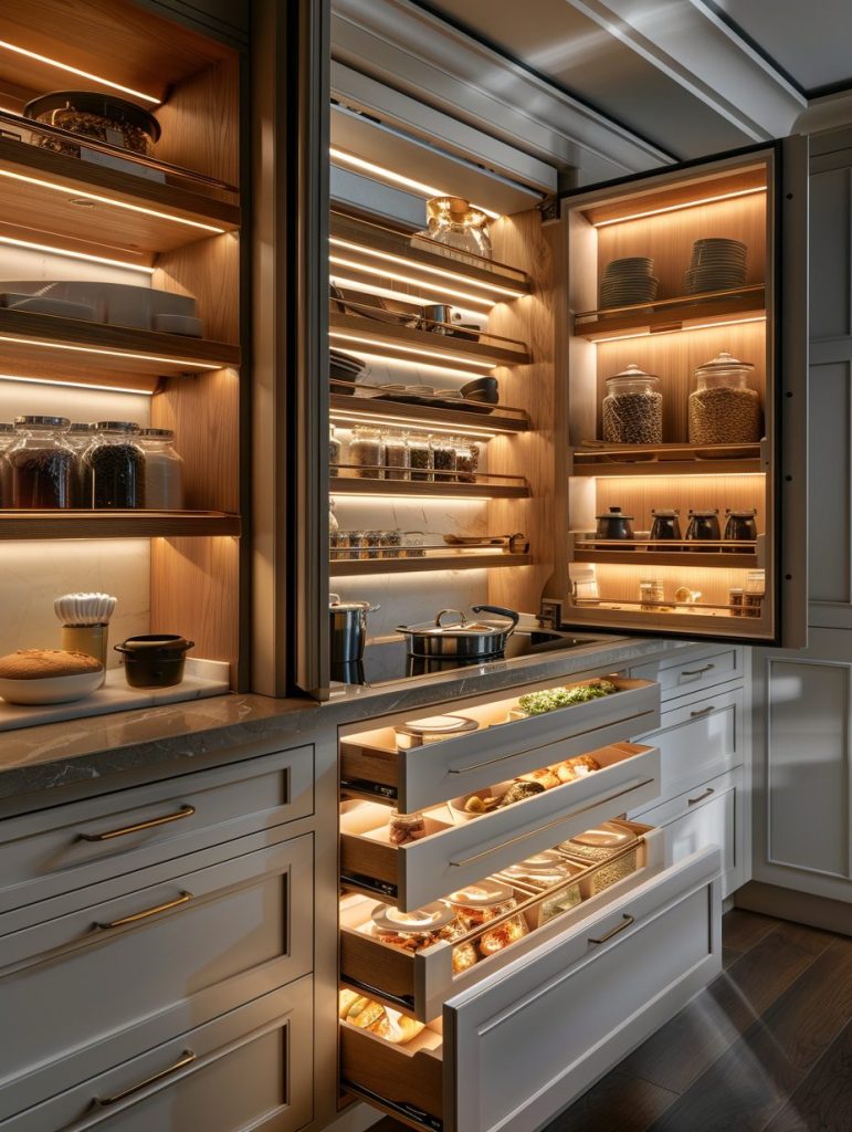 Pantry cabinets with integrated lighting combine modern design with advanced functionality, enhancing both visibility and ambiance. Often featuring glass panels, these cabinets showcase their contents beautifully while maintaining a sleek look.
