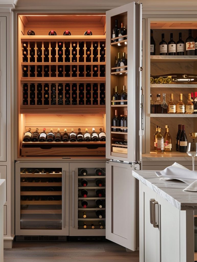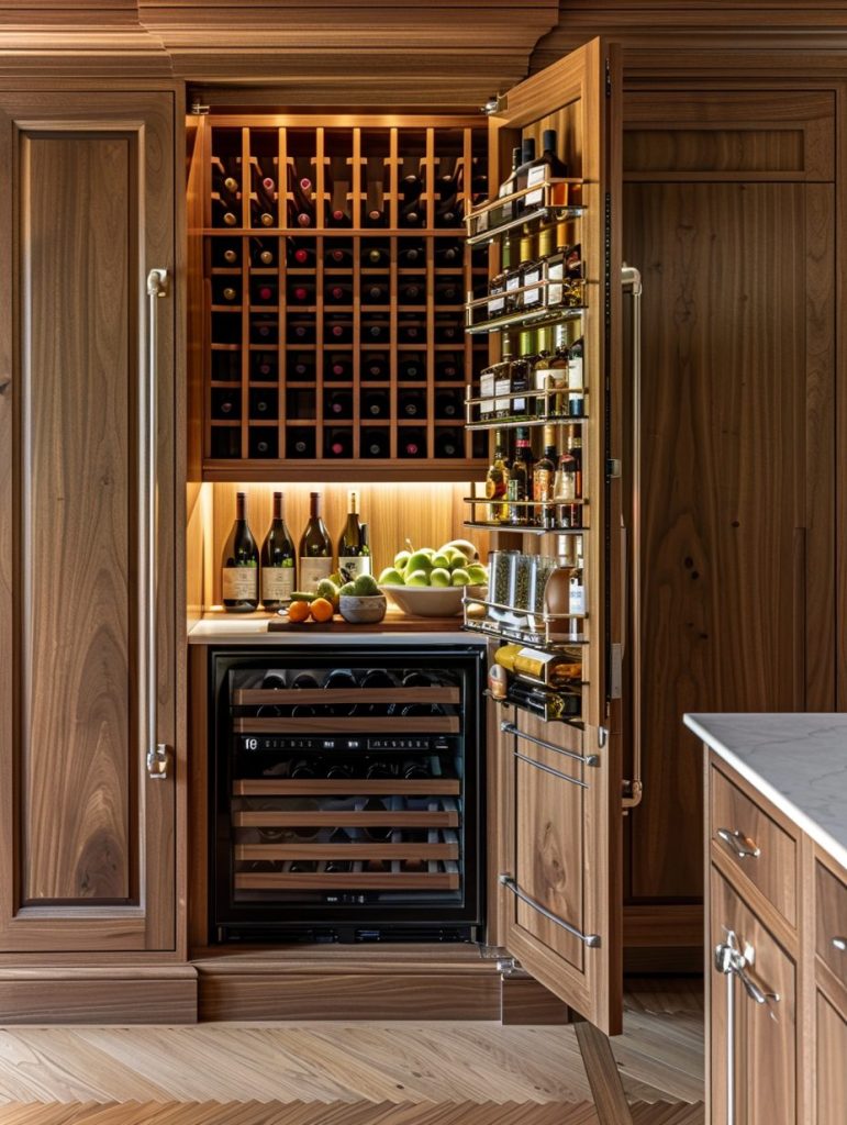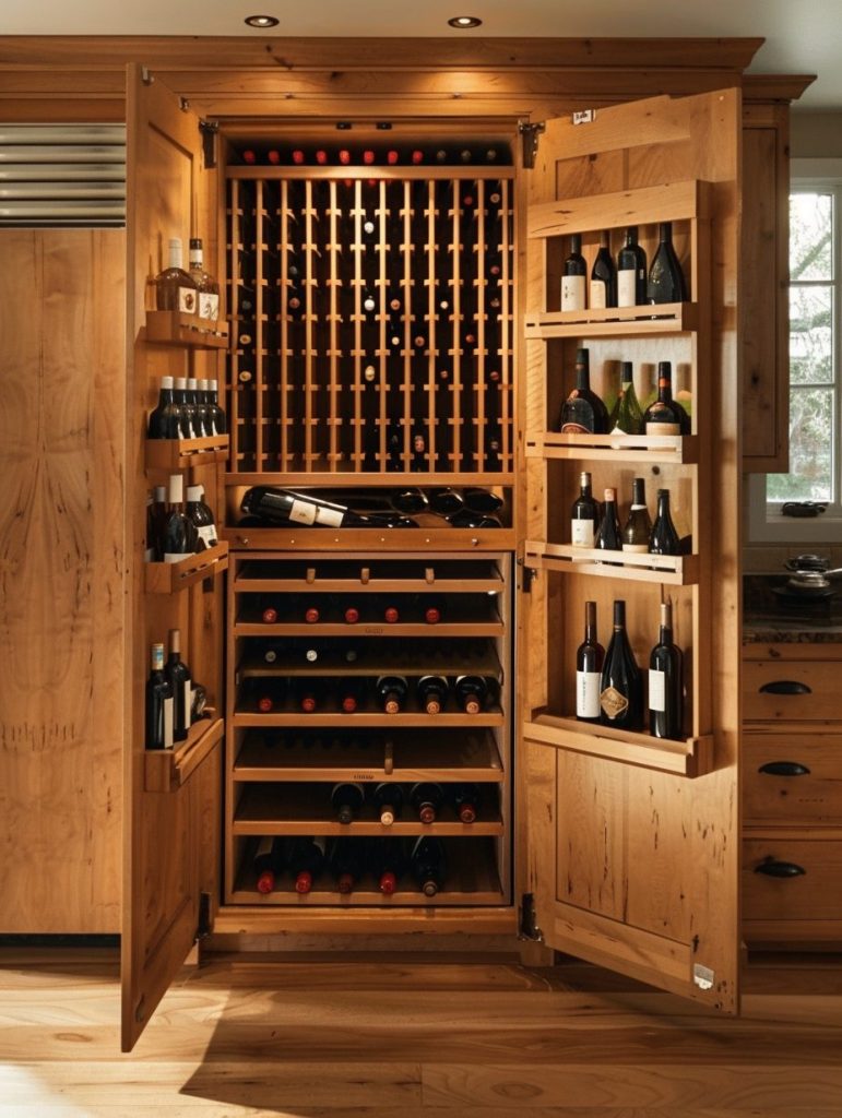 Pantry cabinets with wine storage are tailored for wine enthusiasts who want both function and flair in their kitchen. These specialized cabinets often include built-in wine racks, refrigerated sections, and additional shelving for wine-related accessories.