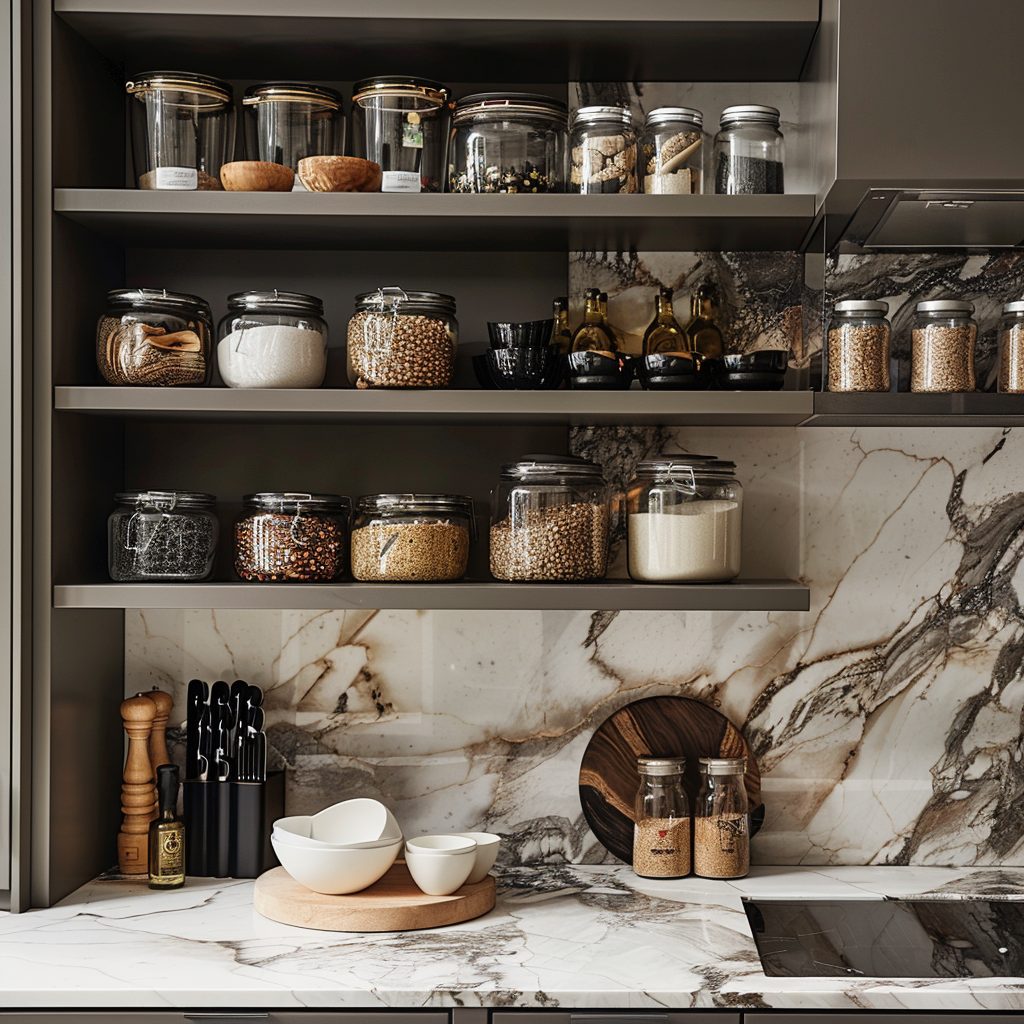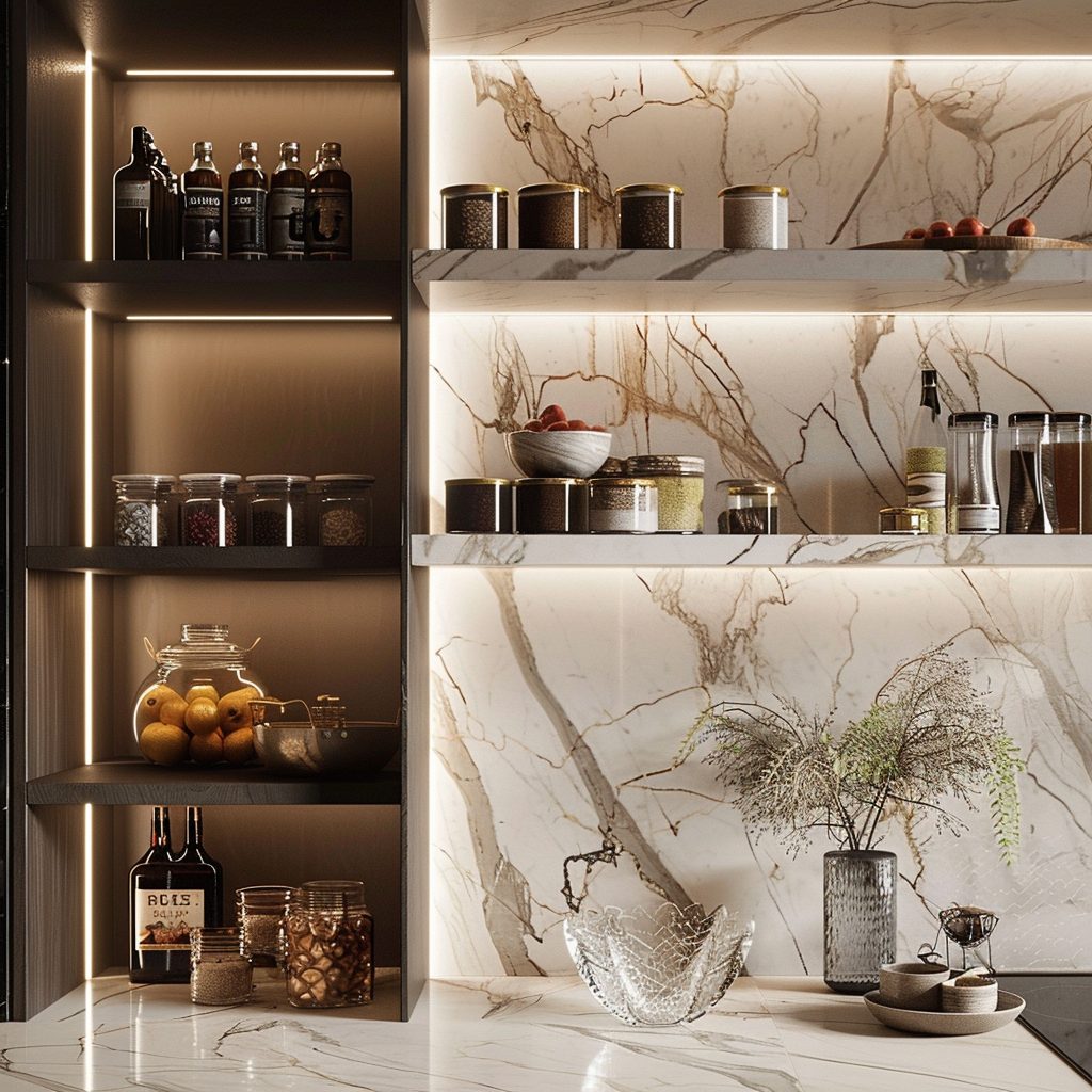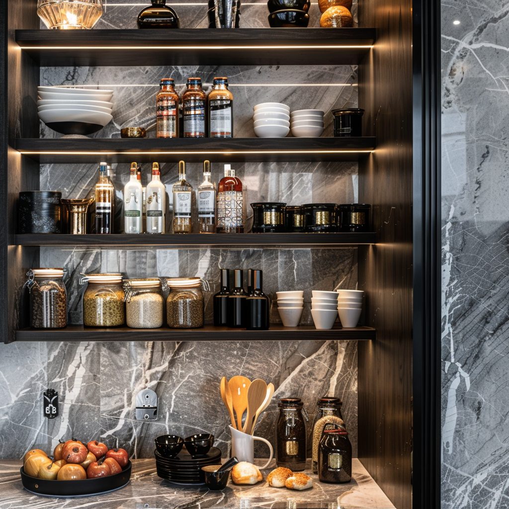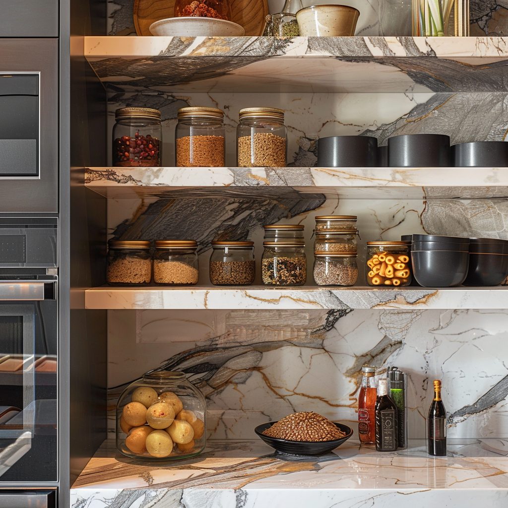 Luxe marble pantry shelves bring a timeless elegance to any kitchen space. Known for their high-end appeal, marble surfaces provide both durability and aesthetic charm.