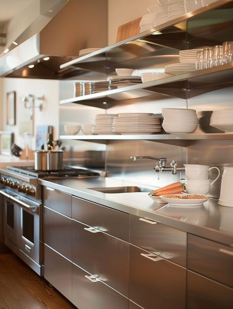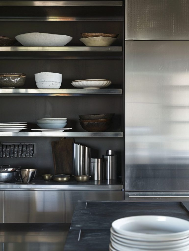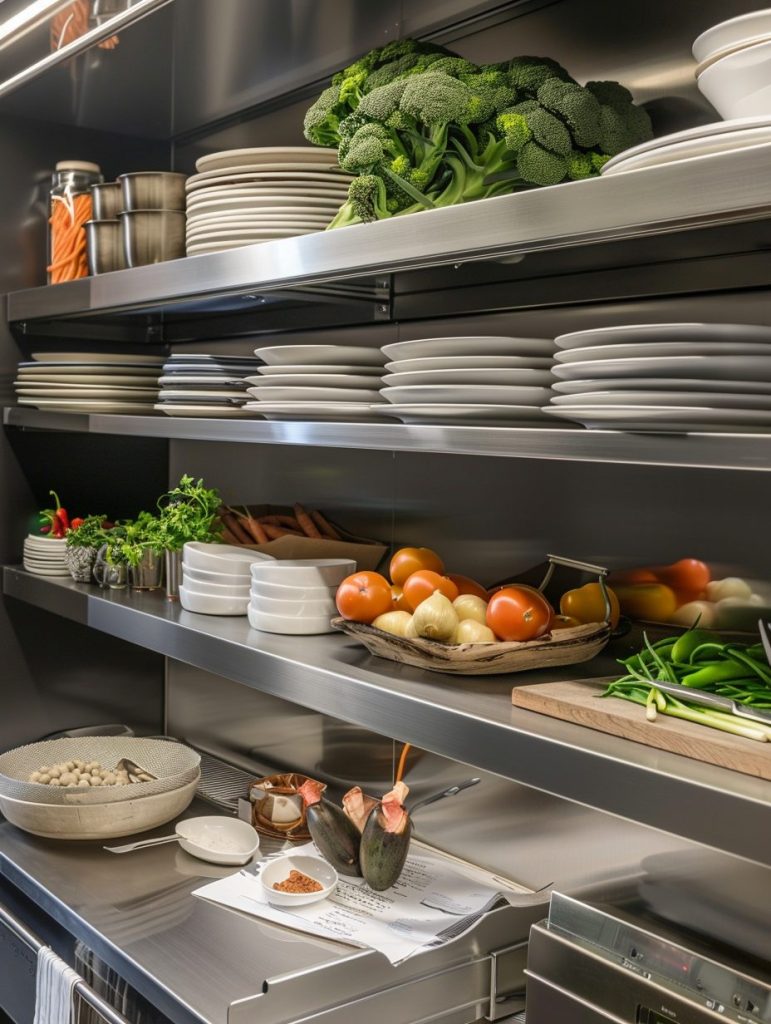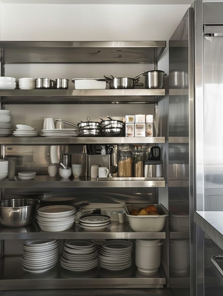 Sleek metal pantry shelving blends contemporary aesthetics with industrial strength, offering both durability and efficient storage.