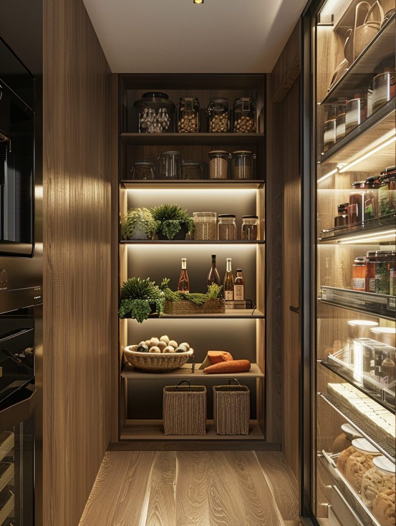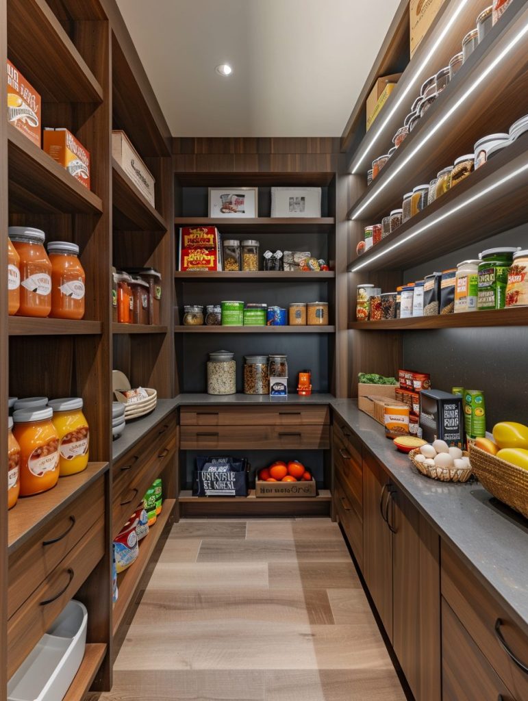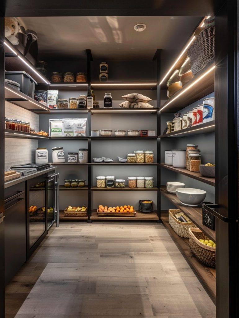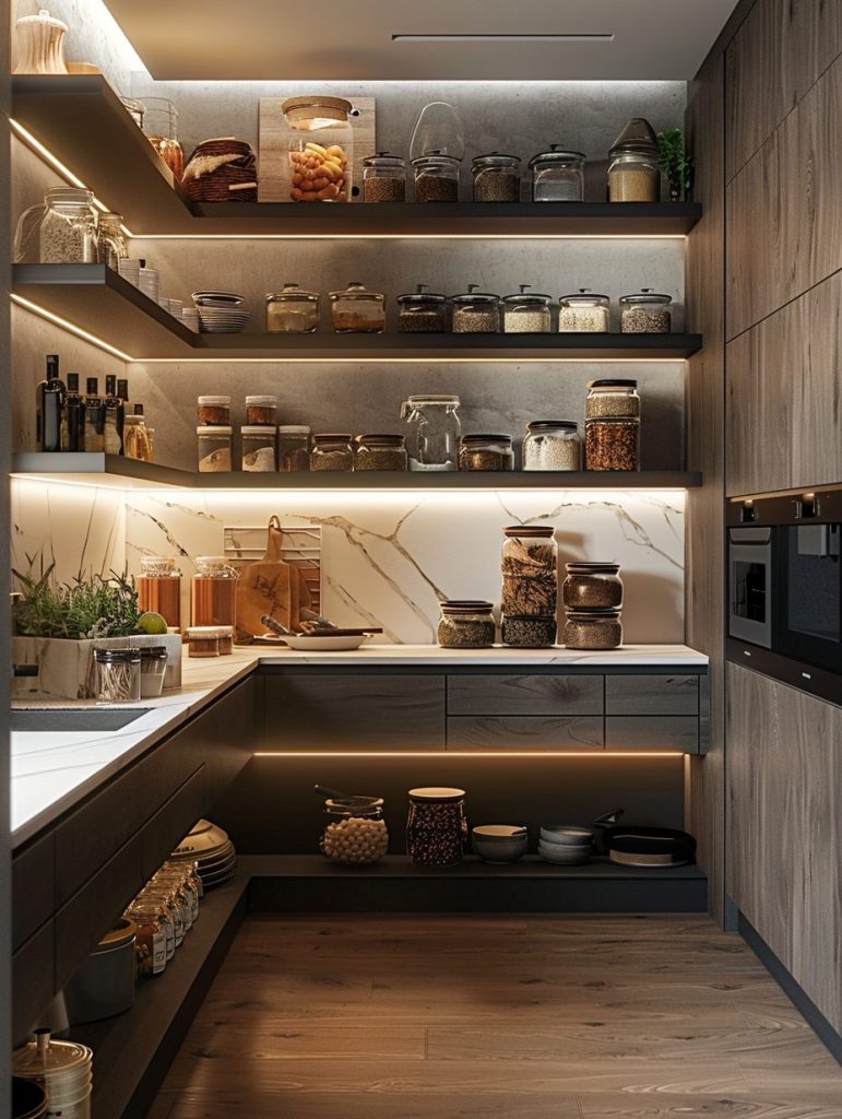 Options like LED strips or under-shelf lighting can brighten up the space and give your pantry a more inviting look.