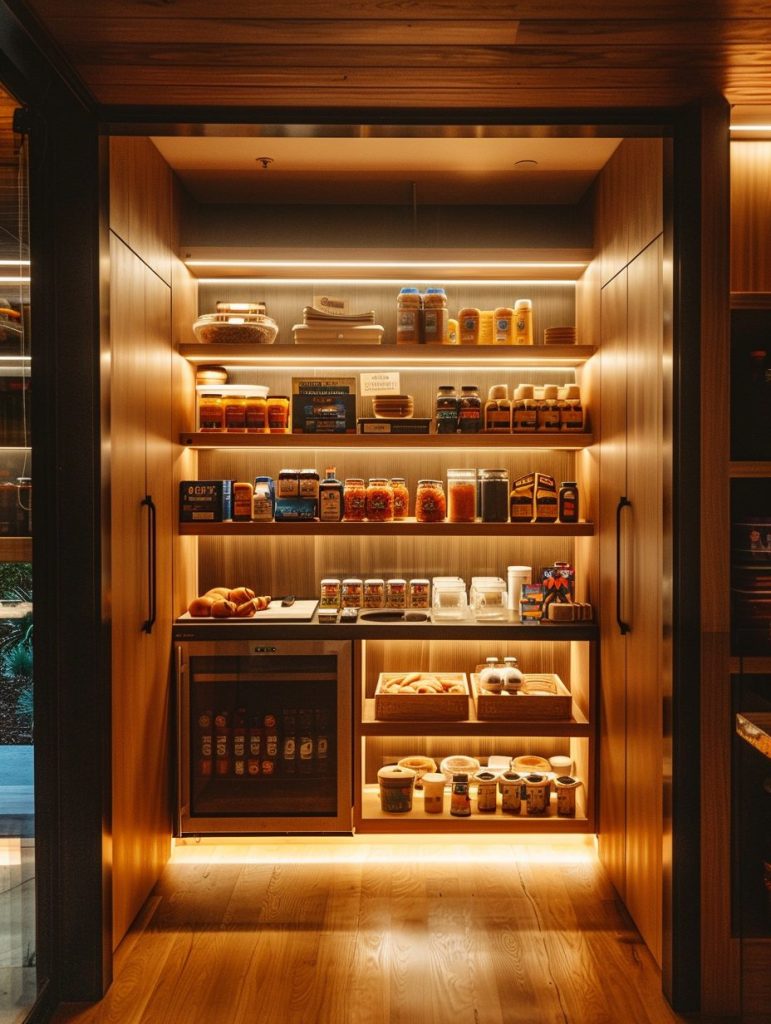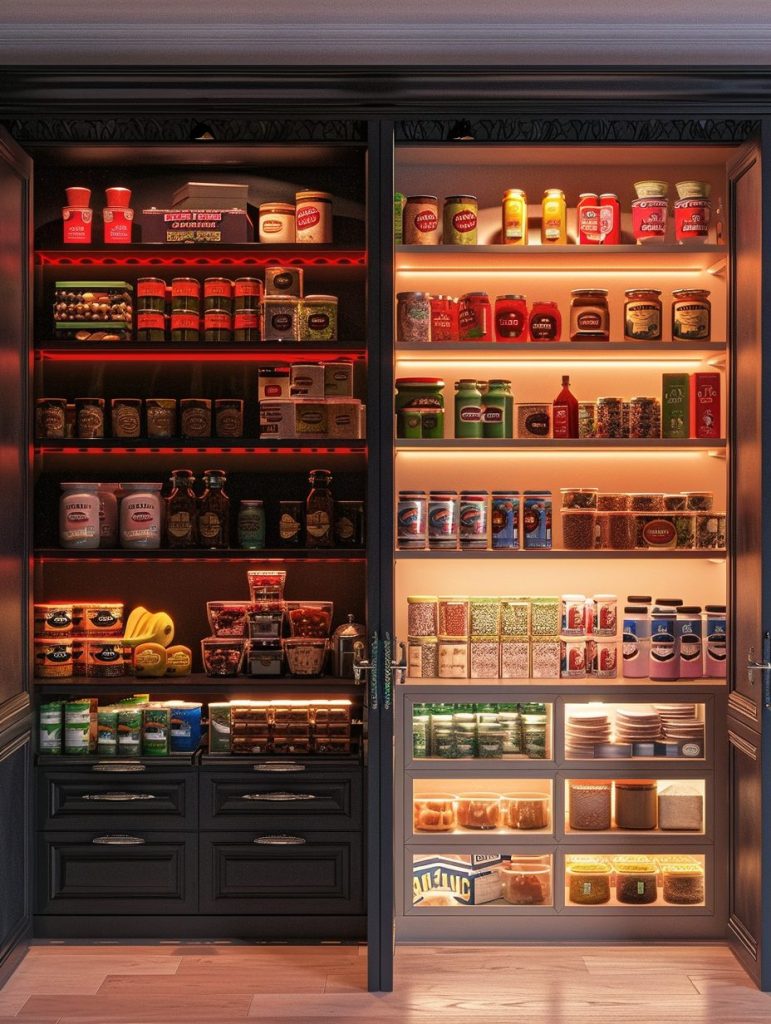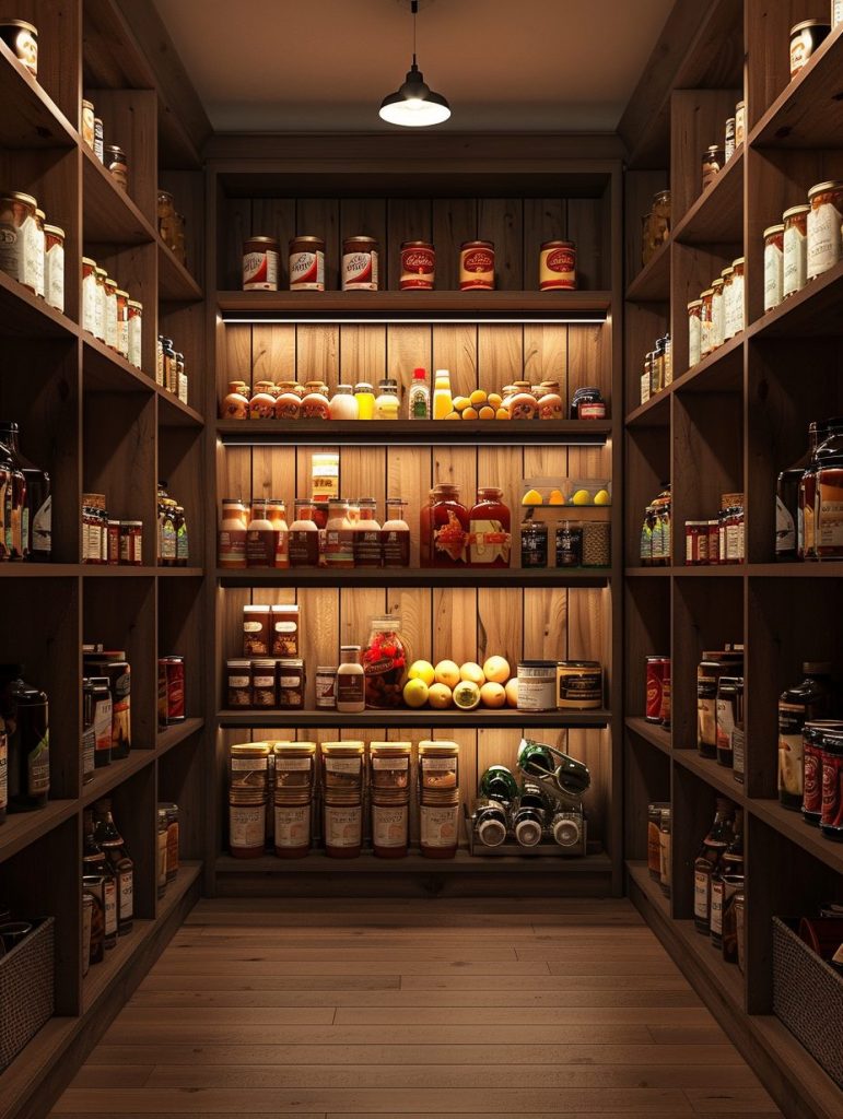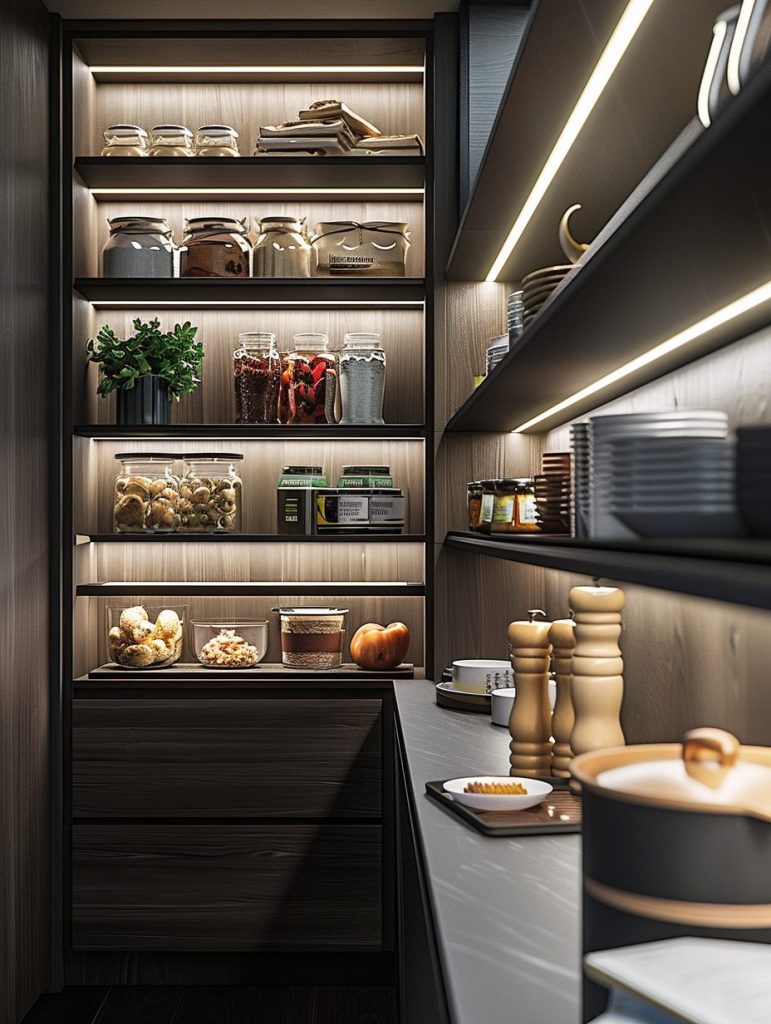 Adding lighting to pantry shelves enhances both functionality and visual appeal.