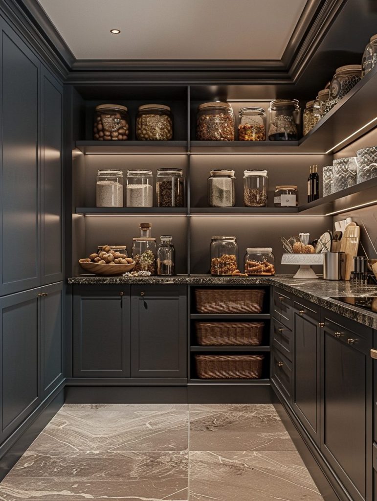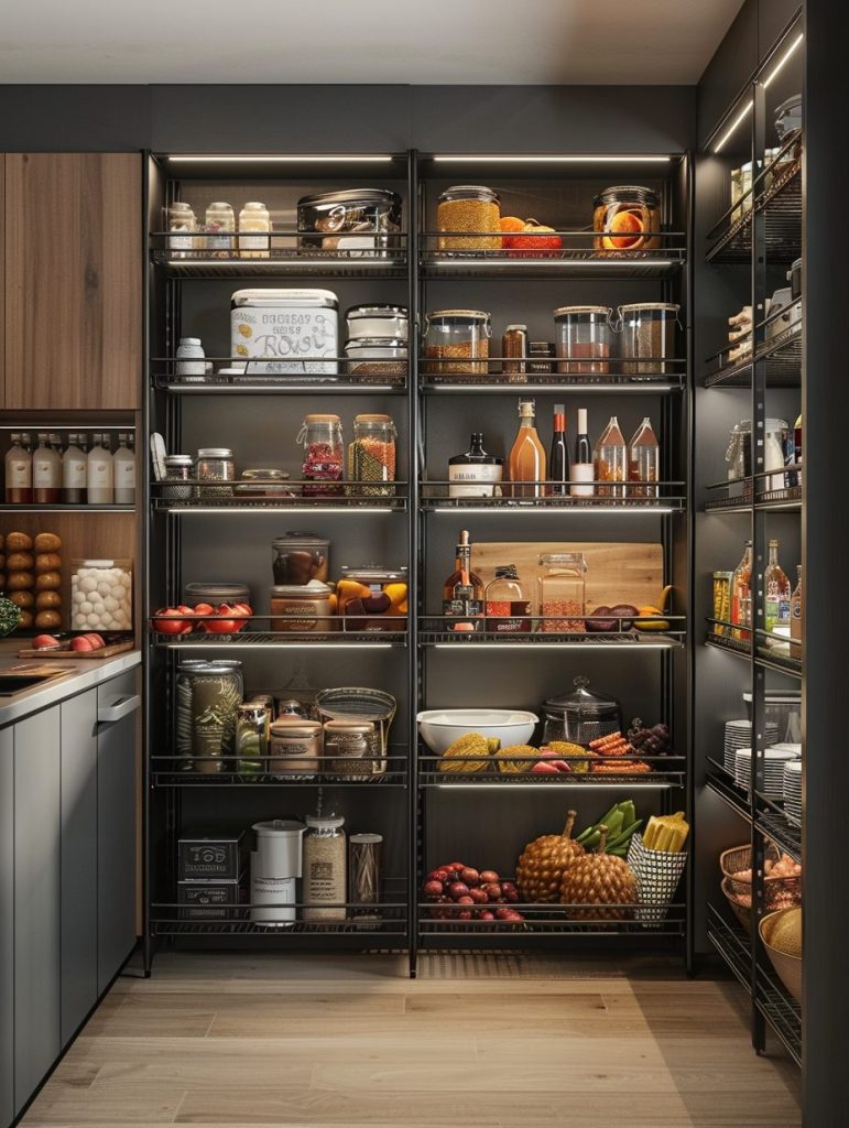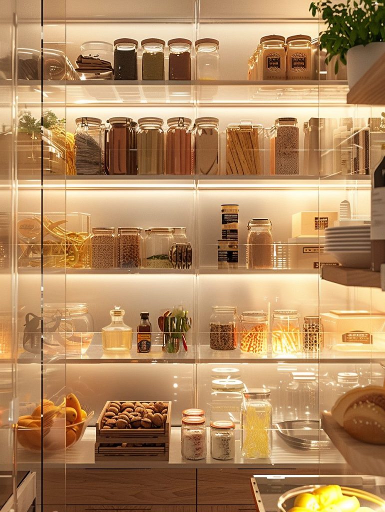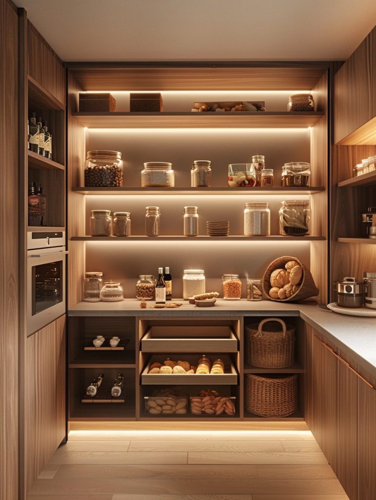 Adding lighting to pantry shelves enhances both functionality and visual appeal.