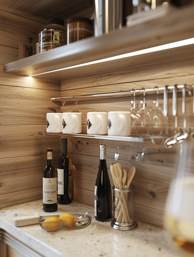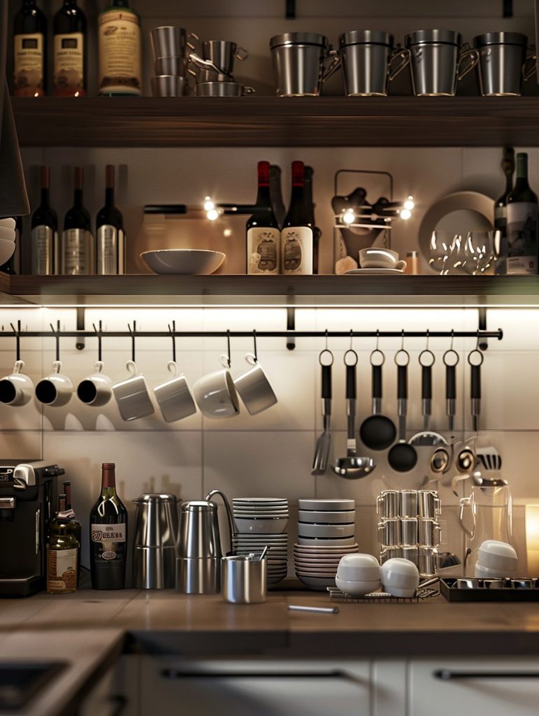 Items like mugs, utensils, or wine bottles can be conveniently hung beneath existing shelves using hooks or racks.