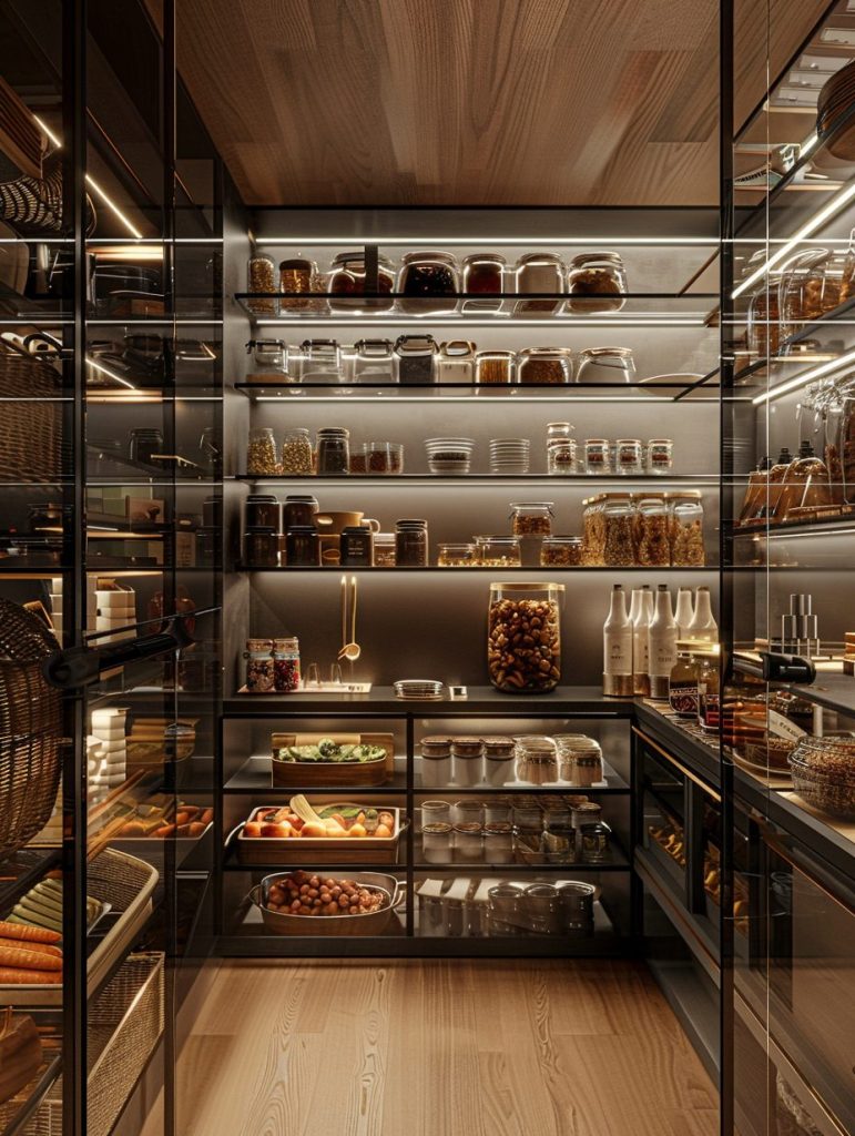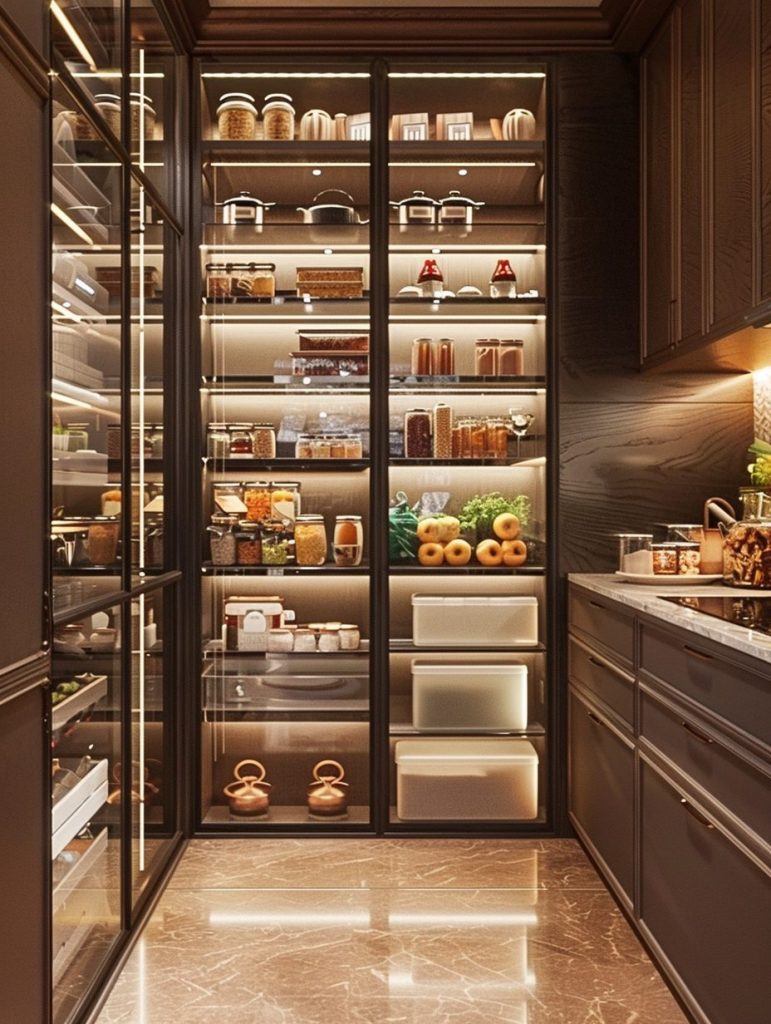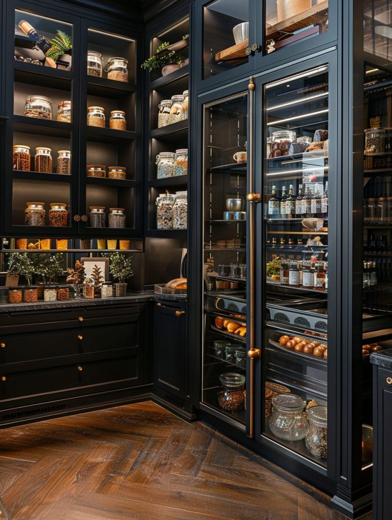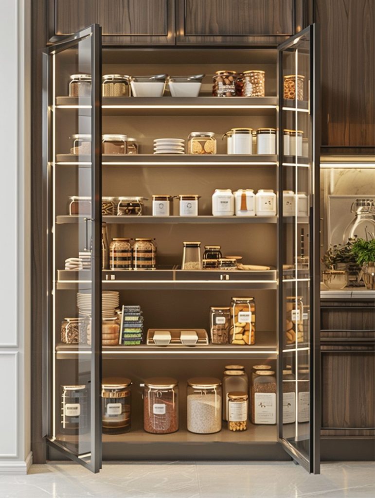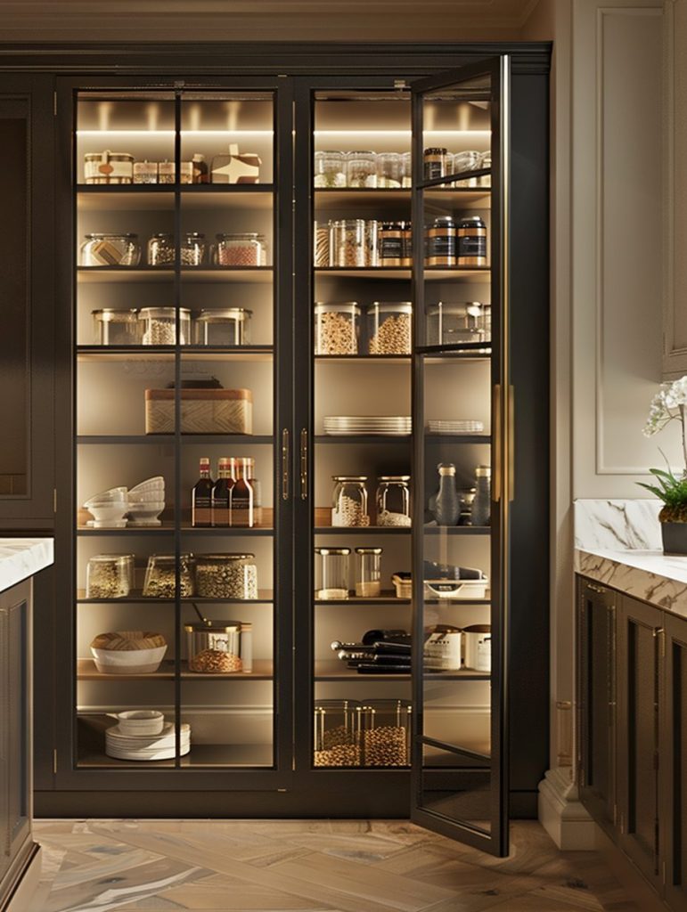 Pantry shelving with glass doors combines functionality with visual appeal.
