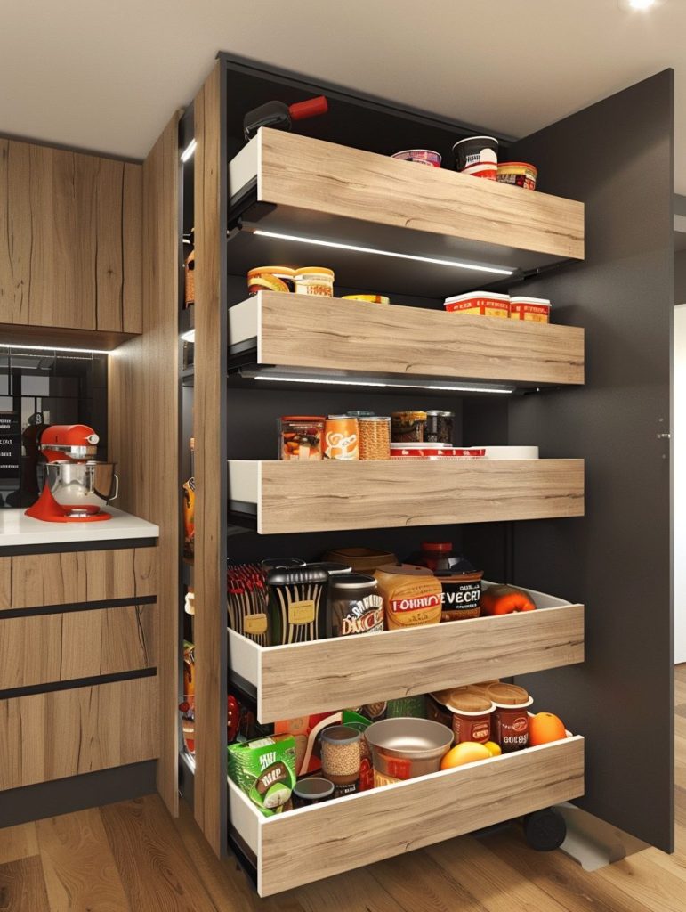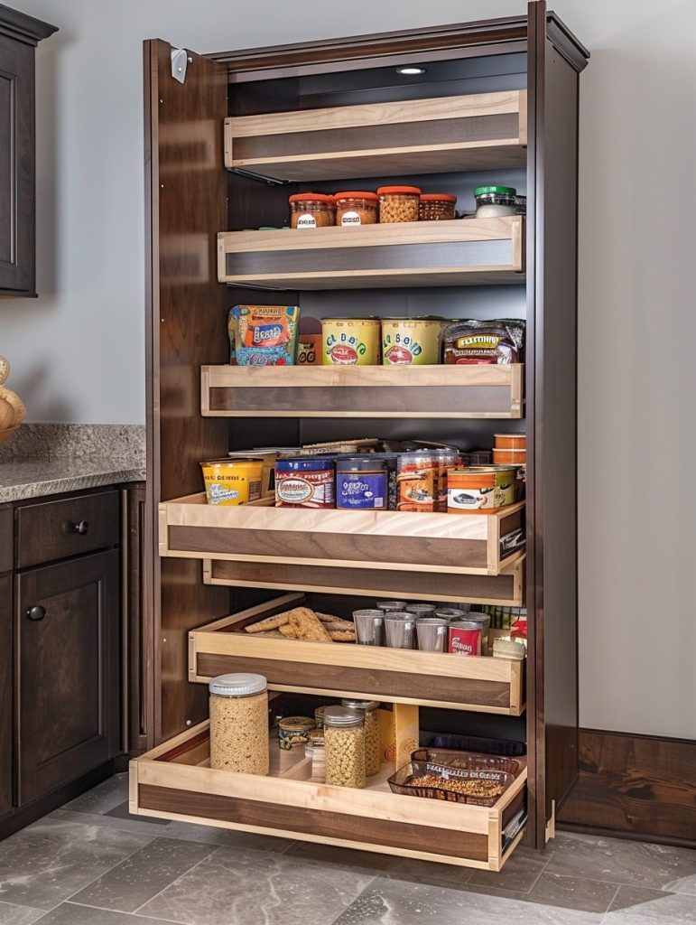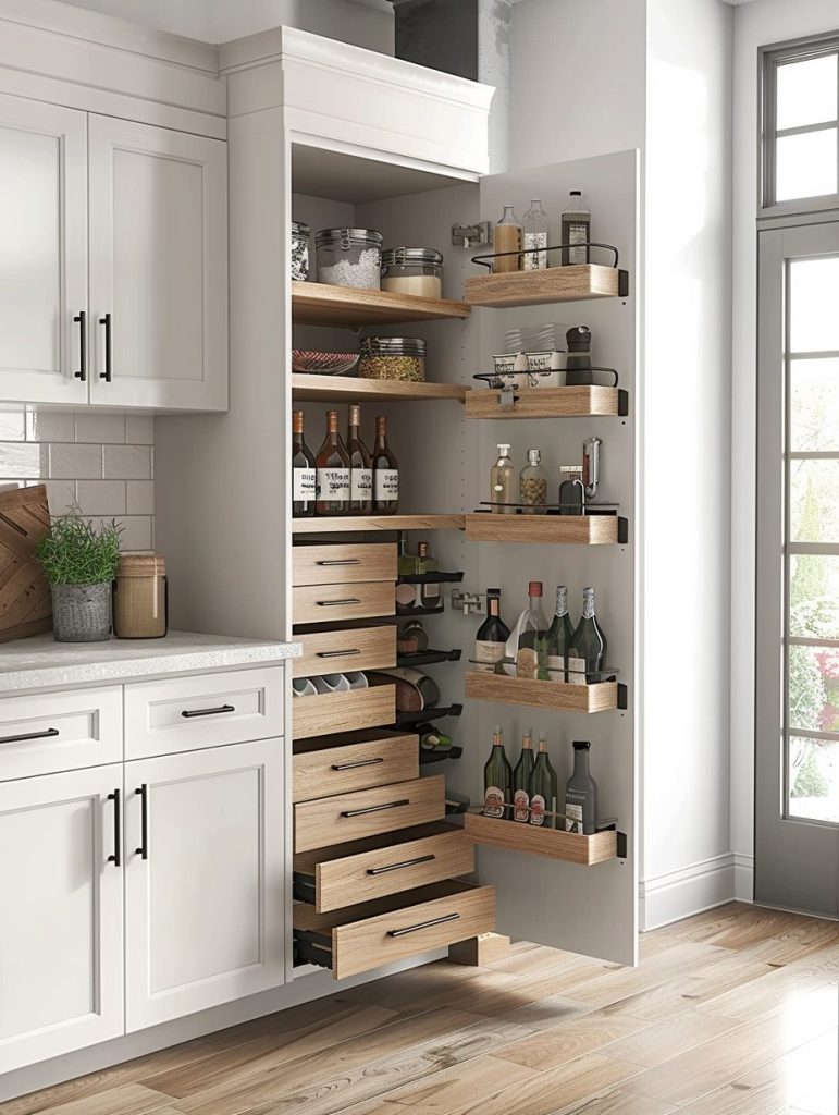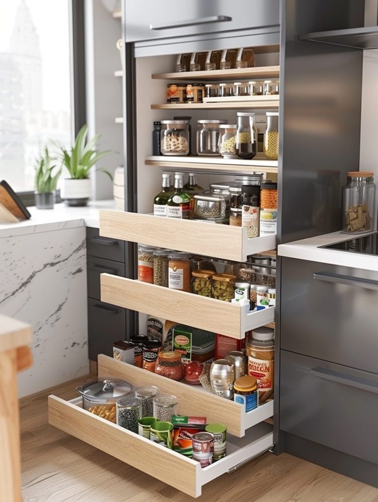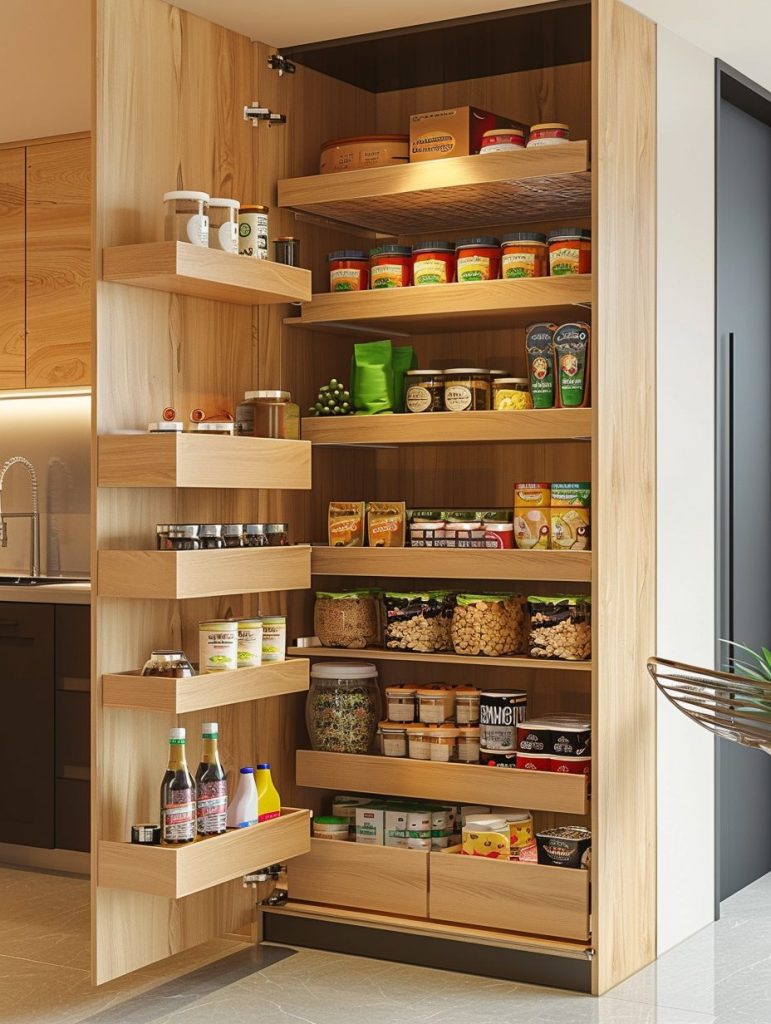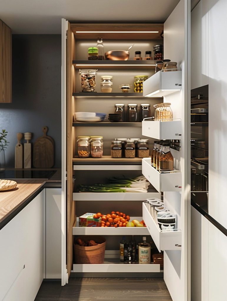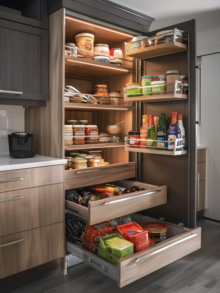 You can install pull-out shelves behind cabinet doors or use sliding panels to tuck away pantry items discreetly.